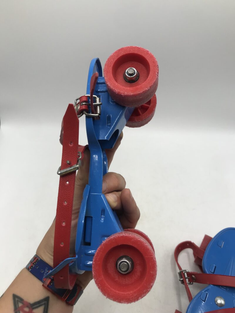 Lot de 2 paires de patins à roulettes Quad « Olympic » vintage . Pour les amoureux du style vintage. Voici un joli duo de patins à roulettes. les patins présentent des signes d’usure (cf photos). La structure est en métal et de couleur bleu, les roues sont rouge. Les patins s’étirent de la taille 17 cm à 21 cm. Parfait pour initier vos petites têtes blondes au plaisir de la glisse. Ou tout simplement de beaux objets pour faire remonter de jolis souvenirs. Et c’est parti pour l’aventure et le fun !!!!!