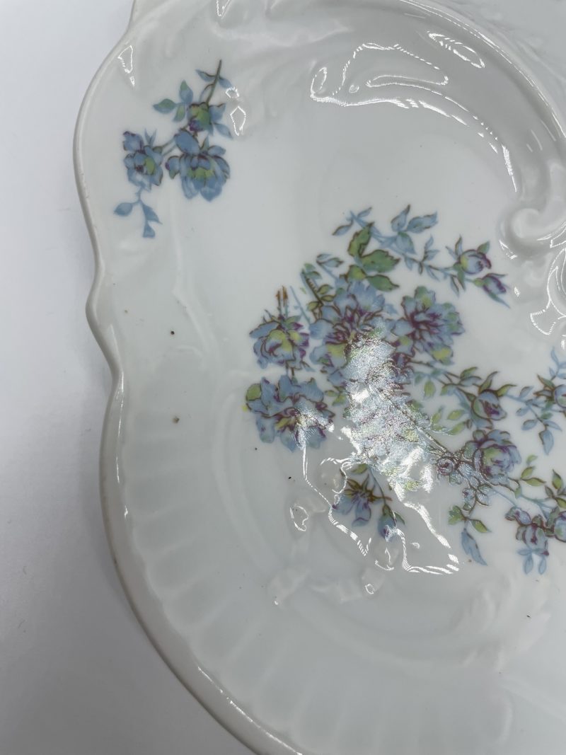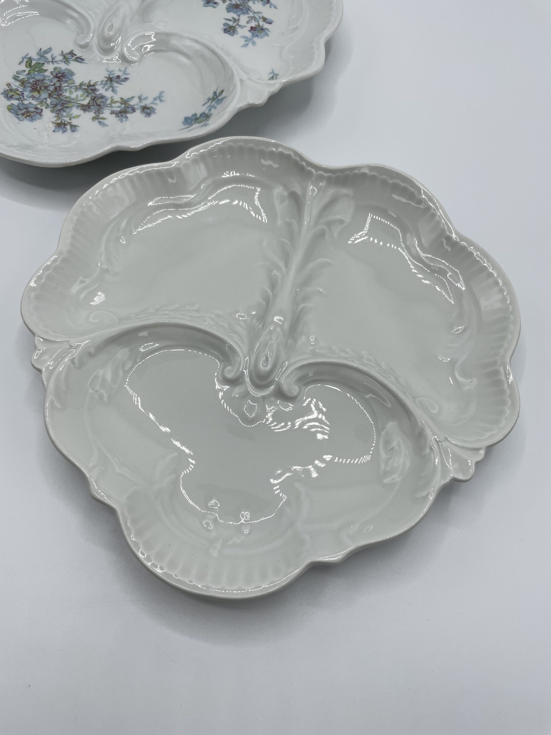 Ce joli duo est composé de 2 plats de service compartimentés. Estampillés porcelaine de Limoges, les deux plats ont 3 compartiments chacun. Le rand plat est équipé d’une poignée et il est décoré d’un joli motif de fleurs bleues et vertes, très romantiques et champêtres. Le petit plat quand à lui est entièrement blanc. Vintage, quelques traces d’usure sont à prévoir (cf photos) jolies marques du temps passé. Deux jolis plats pour poser vos fruits ou servir un joli repas !