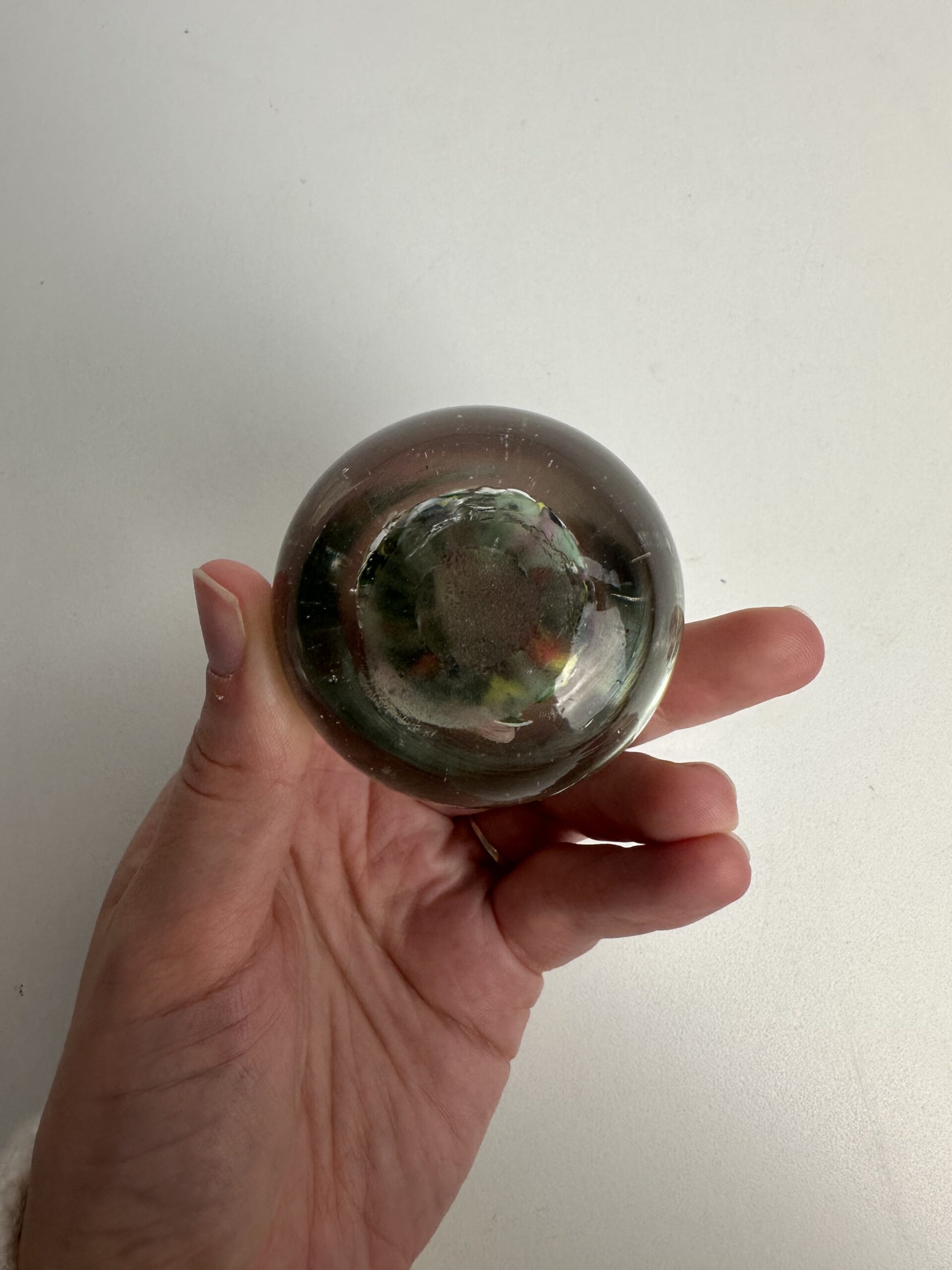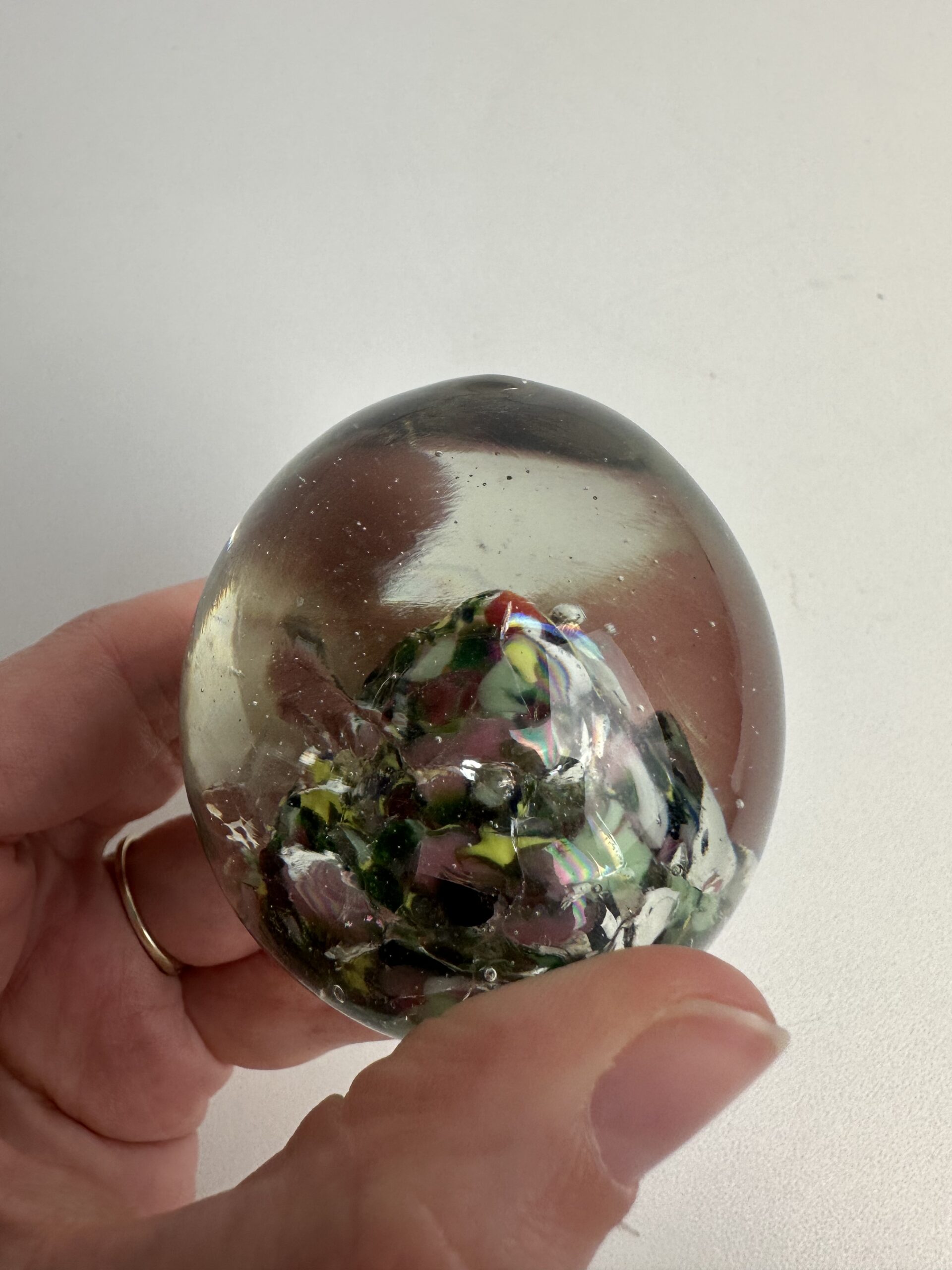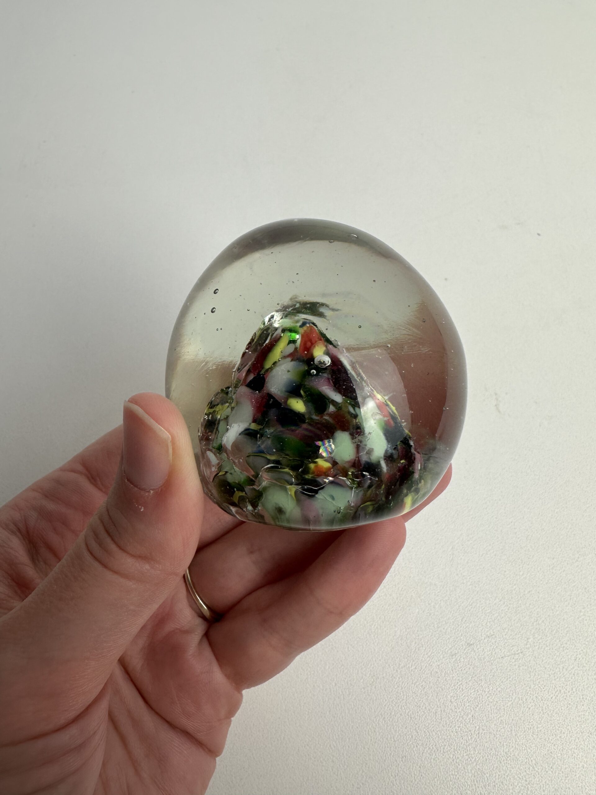 Il y a un premier petit presse papier. Il est transparent avec au centre comme une petite montagne colorée dans des tons de vert, rose et rouge.