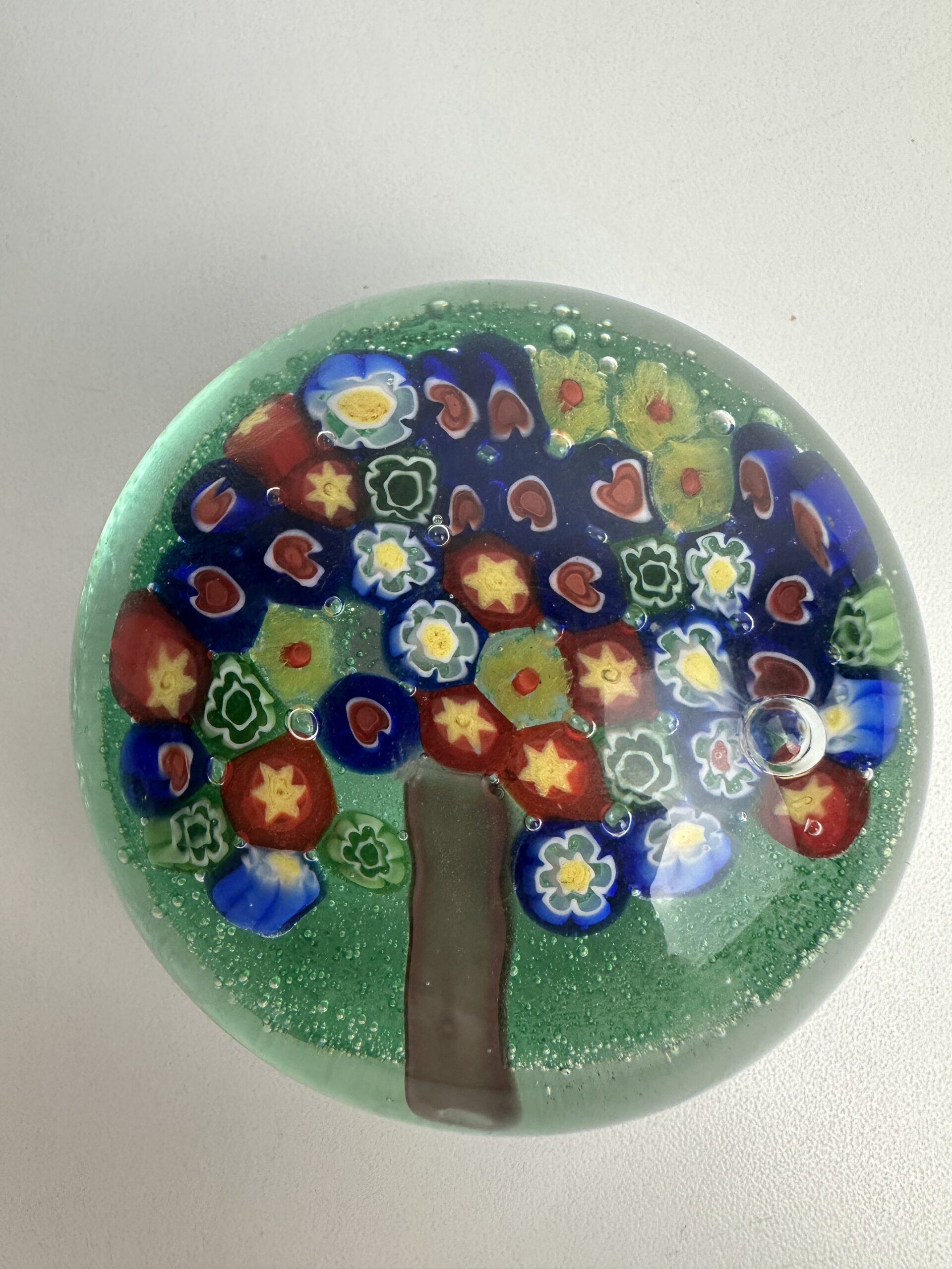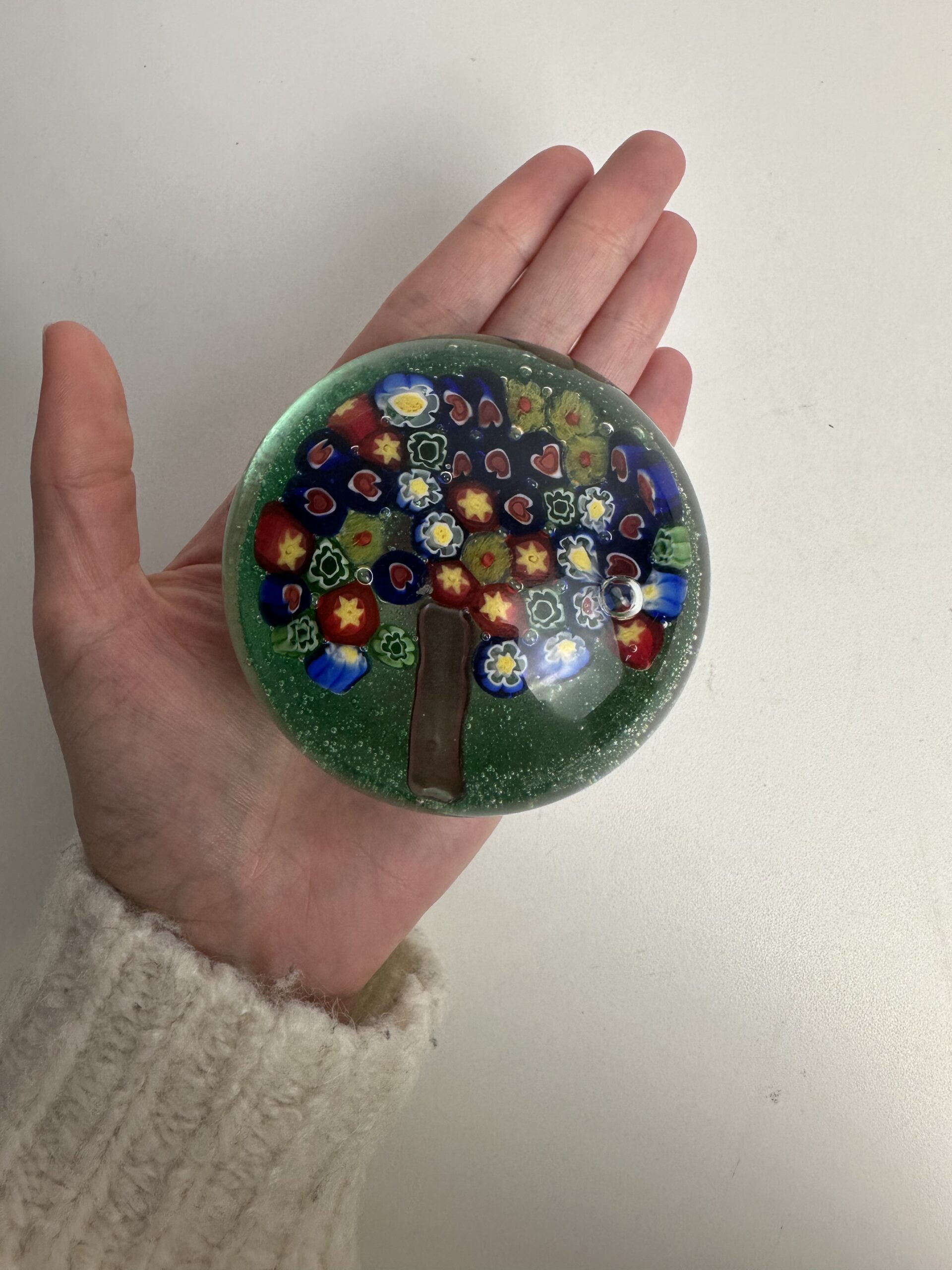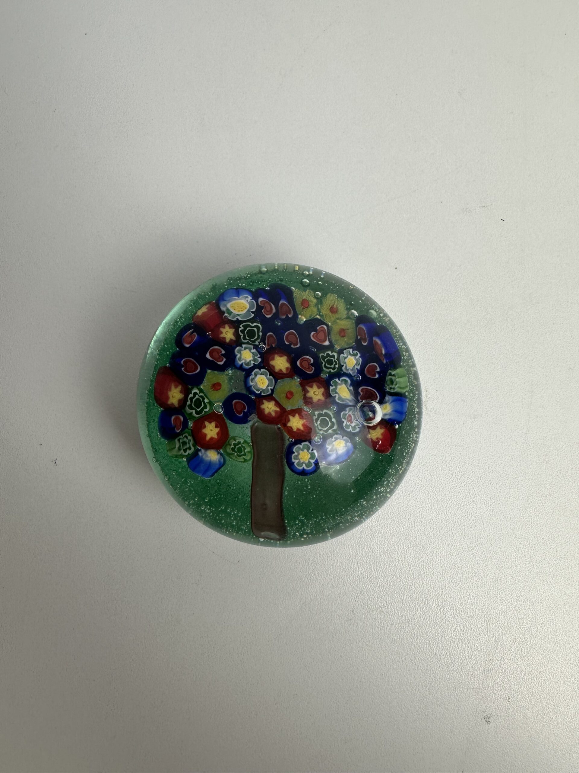 Il y a un premier petit presse papier. Il est transparent avec au centre comme une petite montagne colorée dans des tons de vert, rose et rouge.