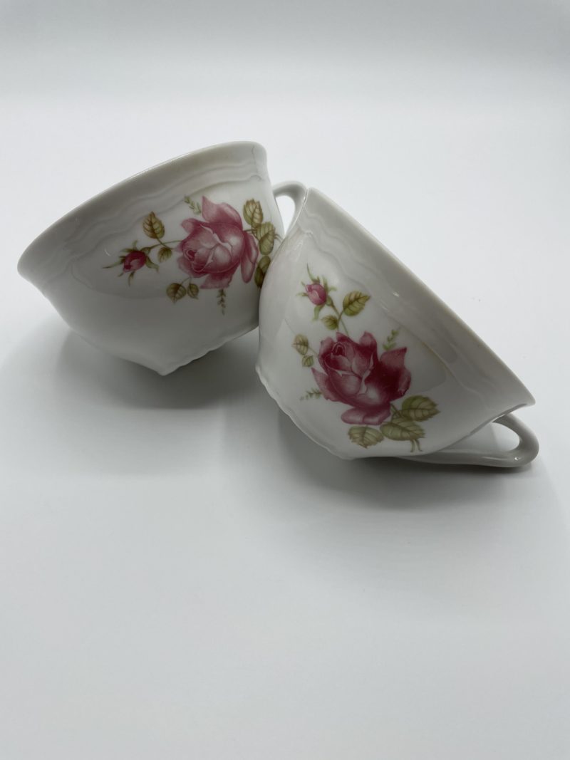 Joli duo de 2 tasses vintage en porcelaine allemande signées « KOROK » et leurs soucoupes assorties. Les tasses et soucoupes sont décorées avec un motif de roses de jardin roses. A la fois romantiques et intemporelles, elles seront parfaites pour vos petits-déjeuners et autres moments thé !