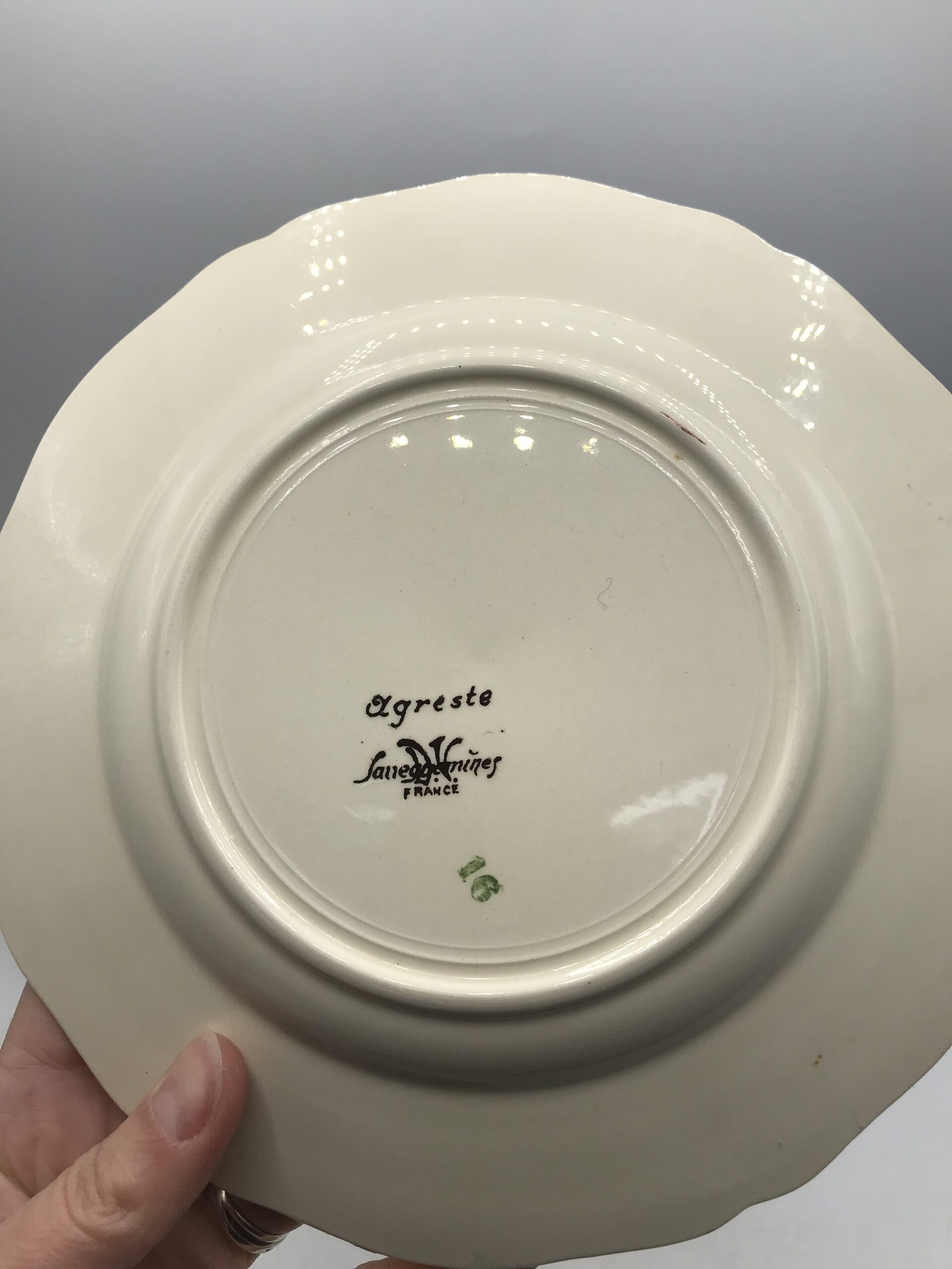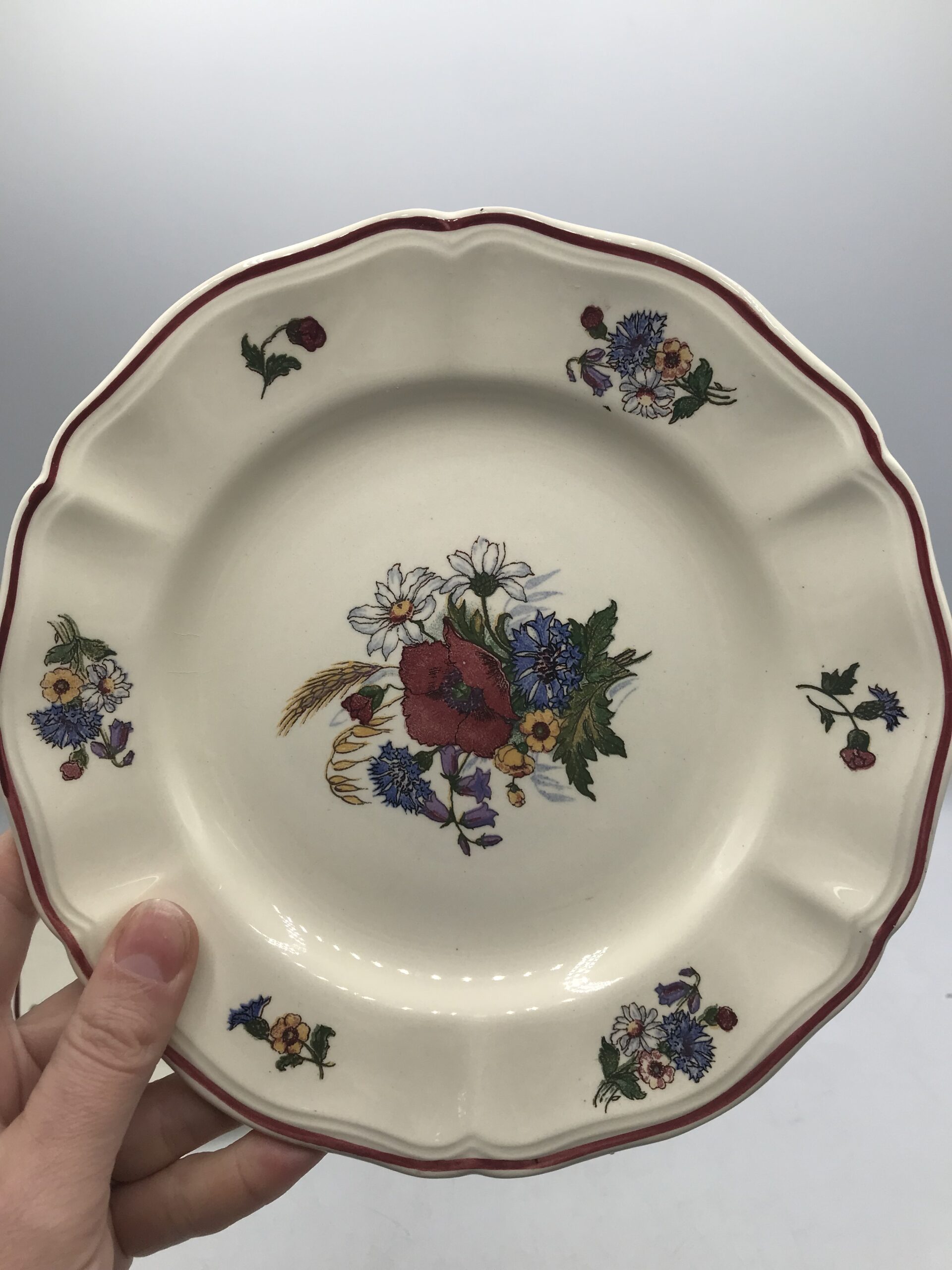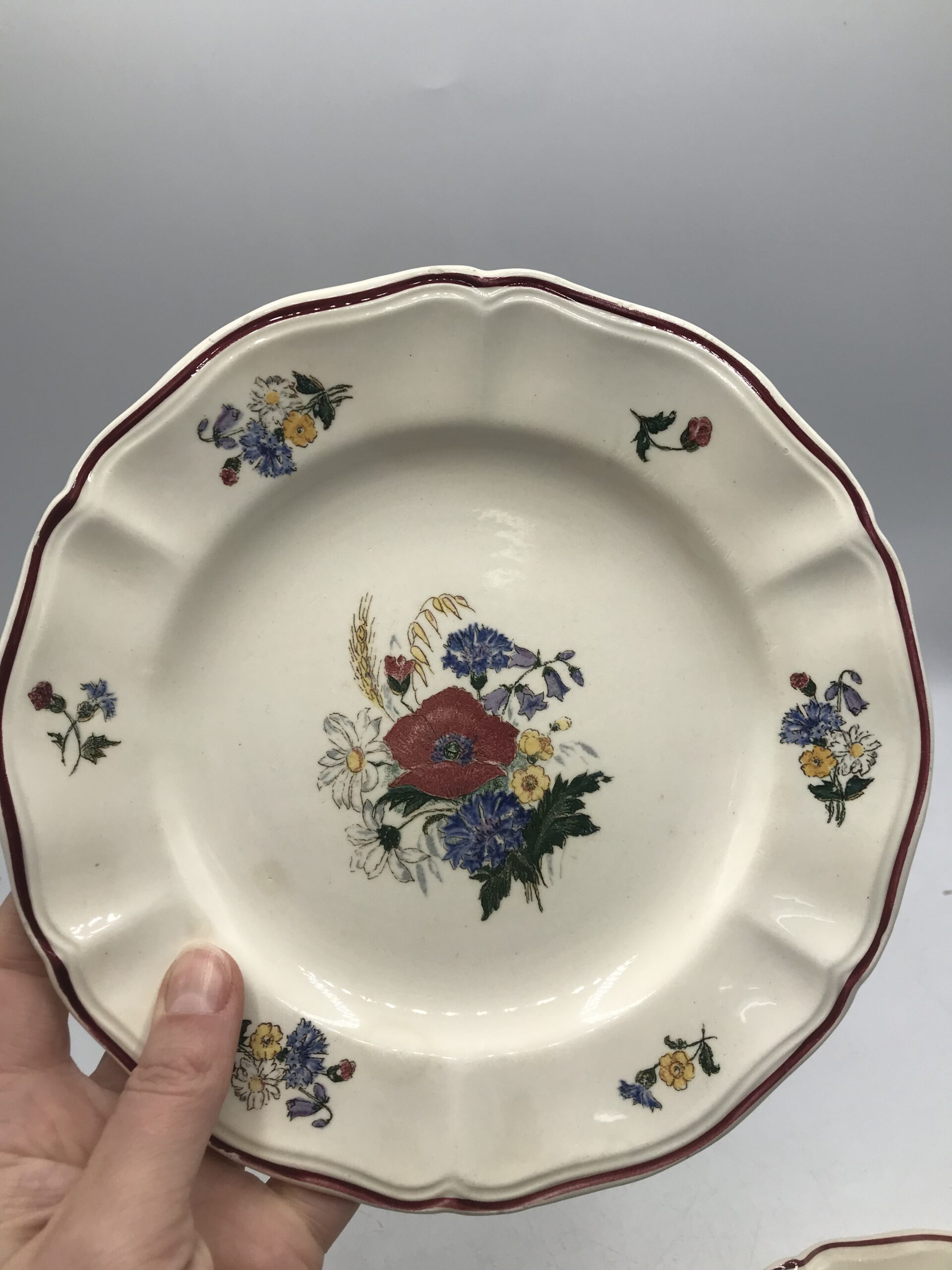 Superbe lot de 3 assiettes Sarreguemines. Le modèle est « Agreste » les assiettes sont de diamètre 21 cm pour une hauteur de 2,5 cm. Modèle emblématique de chez Sarreguemines. Les assiettes présentent des traces d’usures sur les dessins et deux petits éclats sous les assiettes (cf photos). Sur un fond de couleur écrue nous y trouvons un bouquet de fleurs aux couleurs éclatantes, ainsi qu’un liseré de couleur rouge bordeaux sur le contour. De belle assiettes pour les amoureux de pièces anciennes.