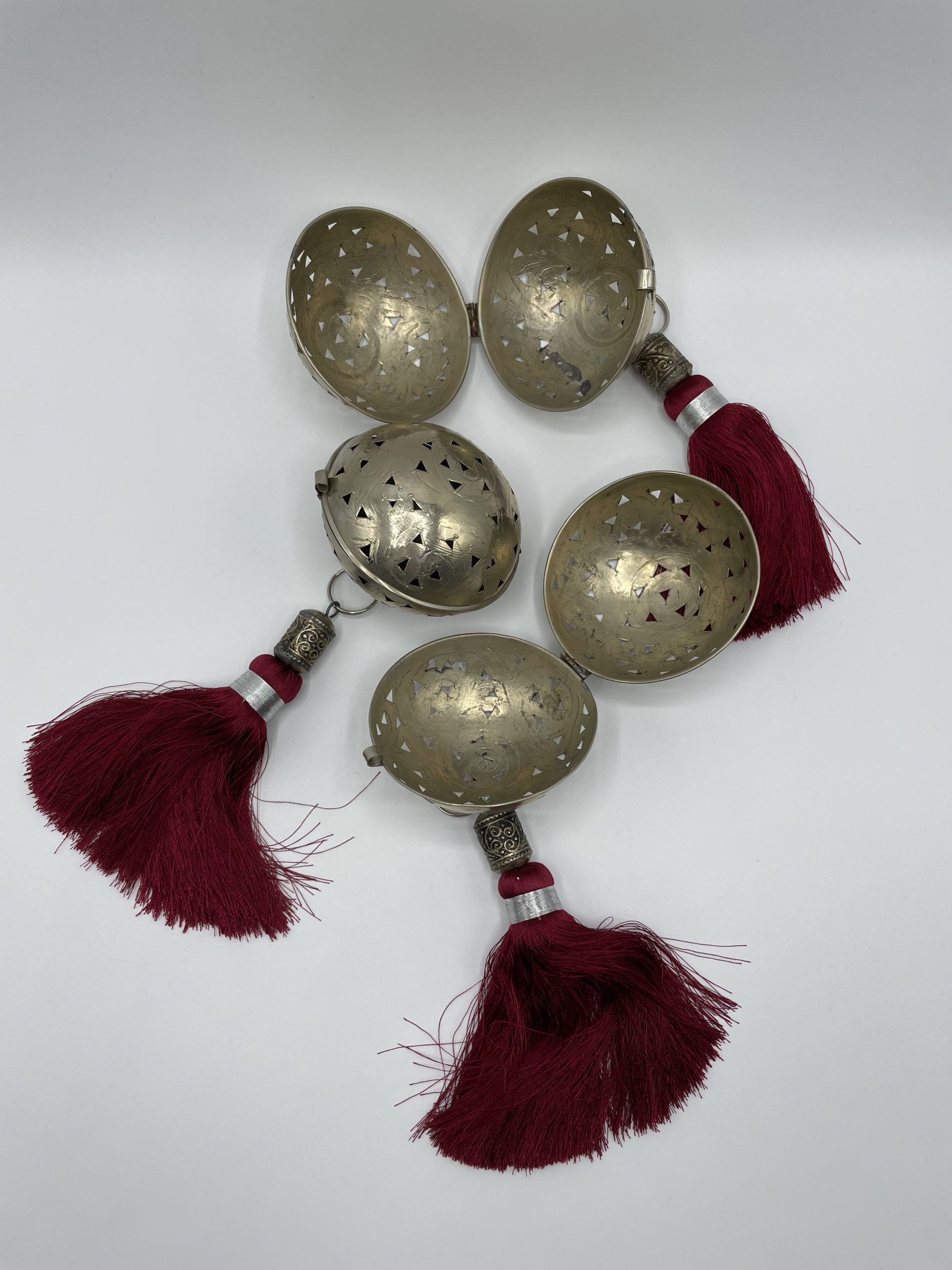 Joli lot de 3 brûle parfum en aluminium de forme boule. Chaque brûle parfum est en forme de boule et est décoré d’un pompon à frange de couleur rouge. Présence d’un petit anneau pour pouvoir les suspendre ou les accrocher.