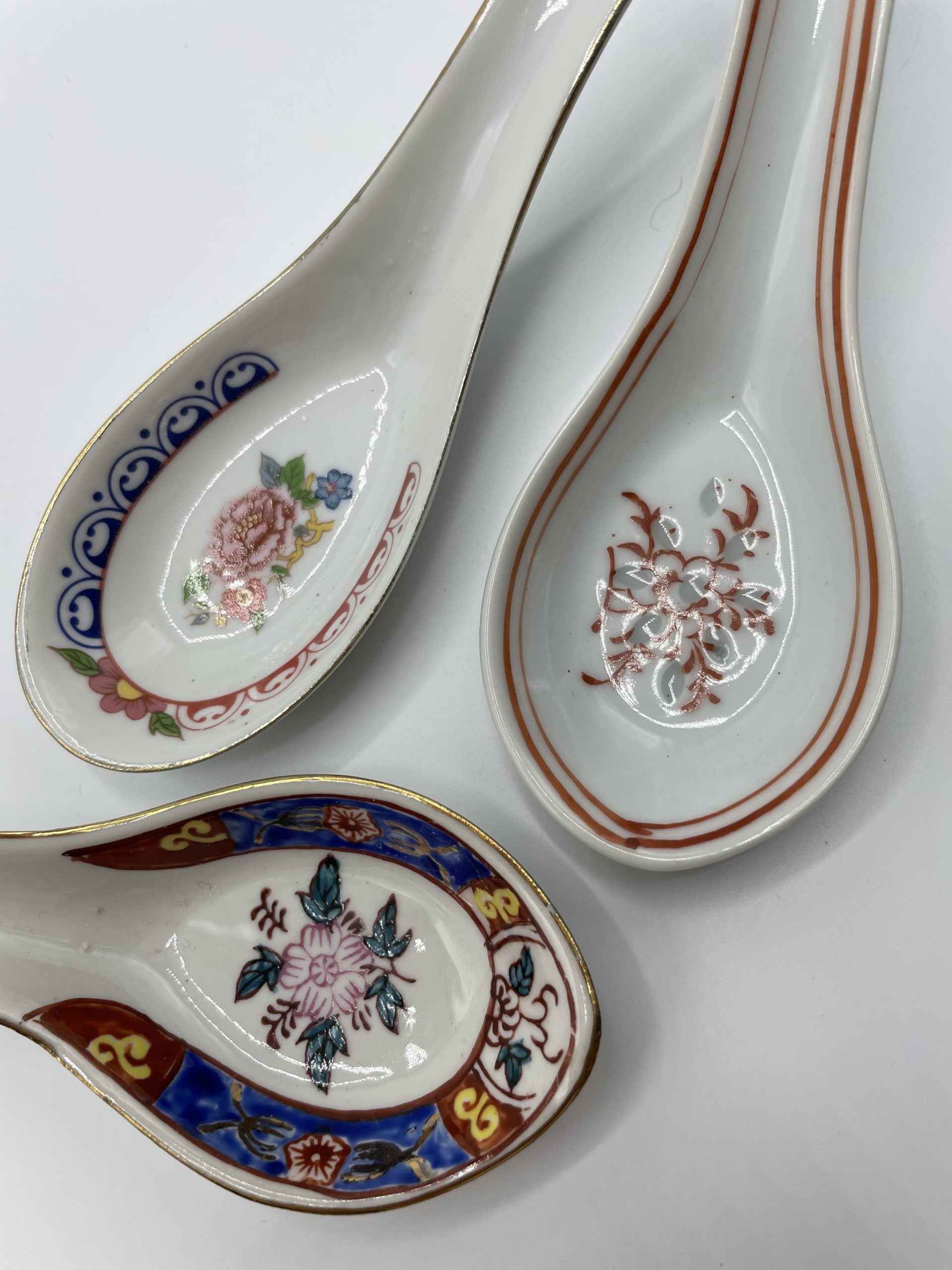 Joli lot de 3 cuillères à soupe chinoises dépareillées peu communes. Le lot est composé de, 3 cuillères en céramiques de taille classique. Deux avec un motif floral, une mosaïque rouge et bleue traditionnelle. Une avec un motif floral et un liseré rouge. Les cuillères sont peintes à la main, et ce sont donc des pièces uniques ! A la différence des cuillères occidentales, le fond plat et profond des cuillères chinoises, assure une plus grande contenance et correspond en outre à une gorgée de soupe.