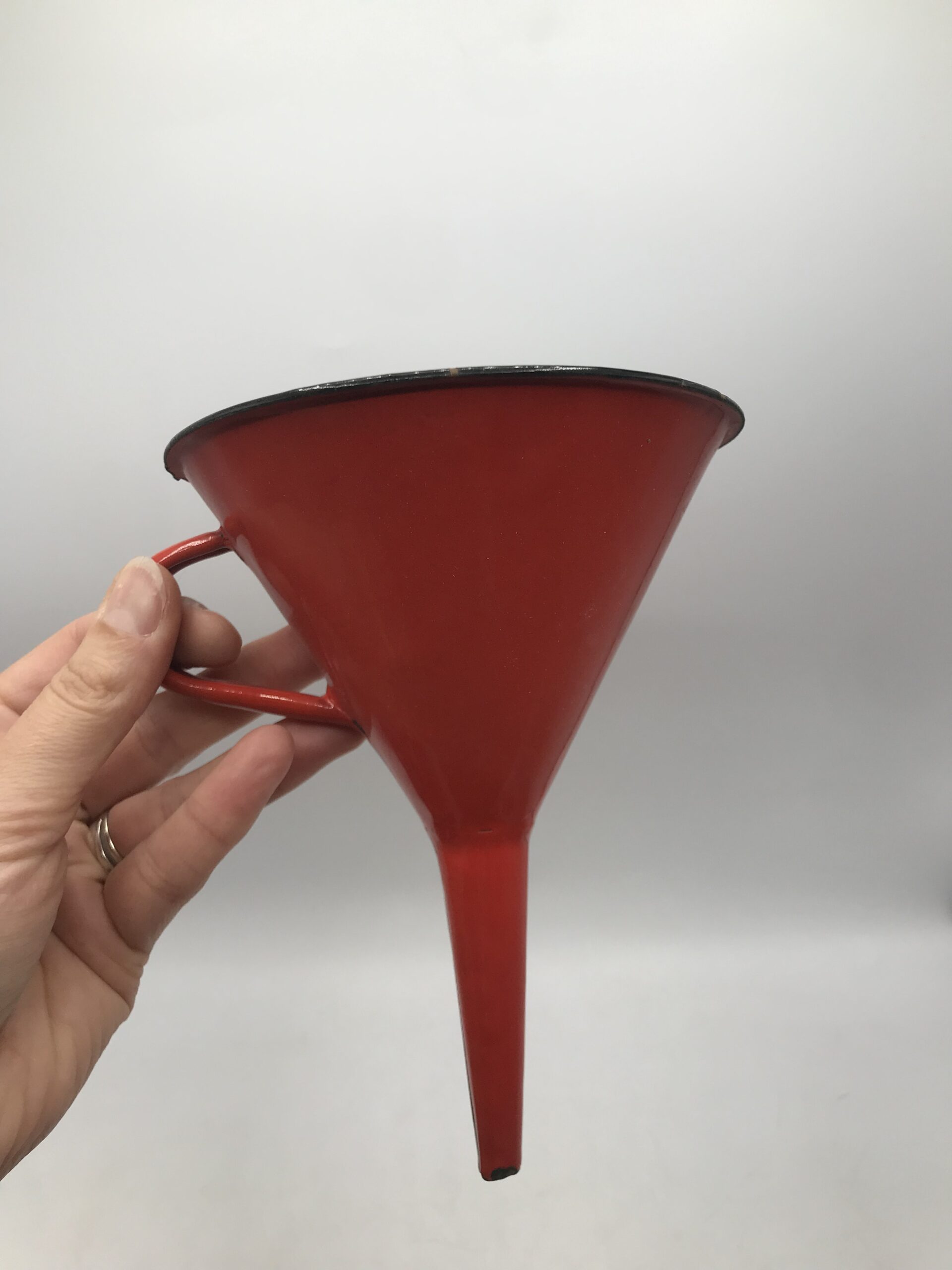 Lot de 3 pièces émail à poids vintage. On continu dans l’émail, cet ensemble est composé d’un grand saladier, d’un moyen saladier et d’un entonnoir. Parfaits éléments de décoration vintage. Le grand saladier est en émail fond rouge pétant à poids blancs. Il a un diamètre de 26 cm pour une hauteur de 8 cm. Le saladier de taille moyenne à un diamètre de 22,5 cm pour une hauteur de 6 cm, il est également en émail fond rouge à poids blancs. Et pour finir ce trio nous avons un entonnoir en émail lui aussi extérieur rouge et intérieur blanc, il a un diamètre de 13 cm pour une hauteur de 16 cm. Ils portent des marques du temps et quelques éclats (cf photos). Un bel ensemble pour marquer les esprits.