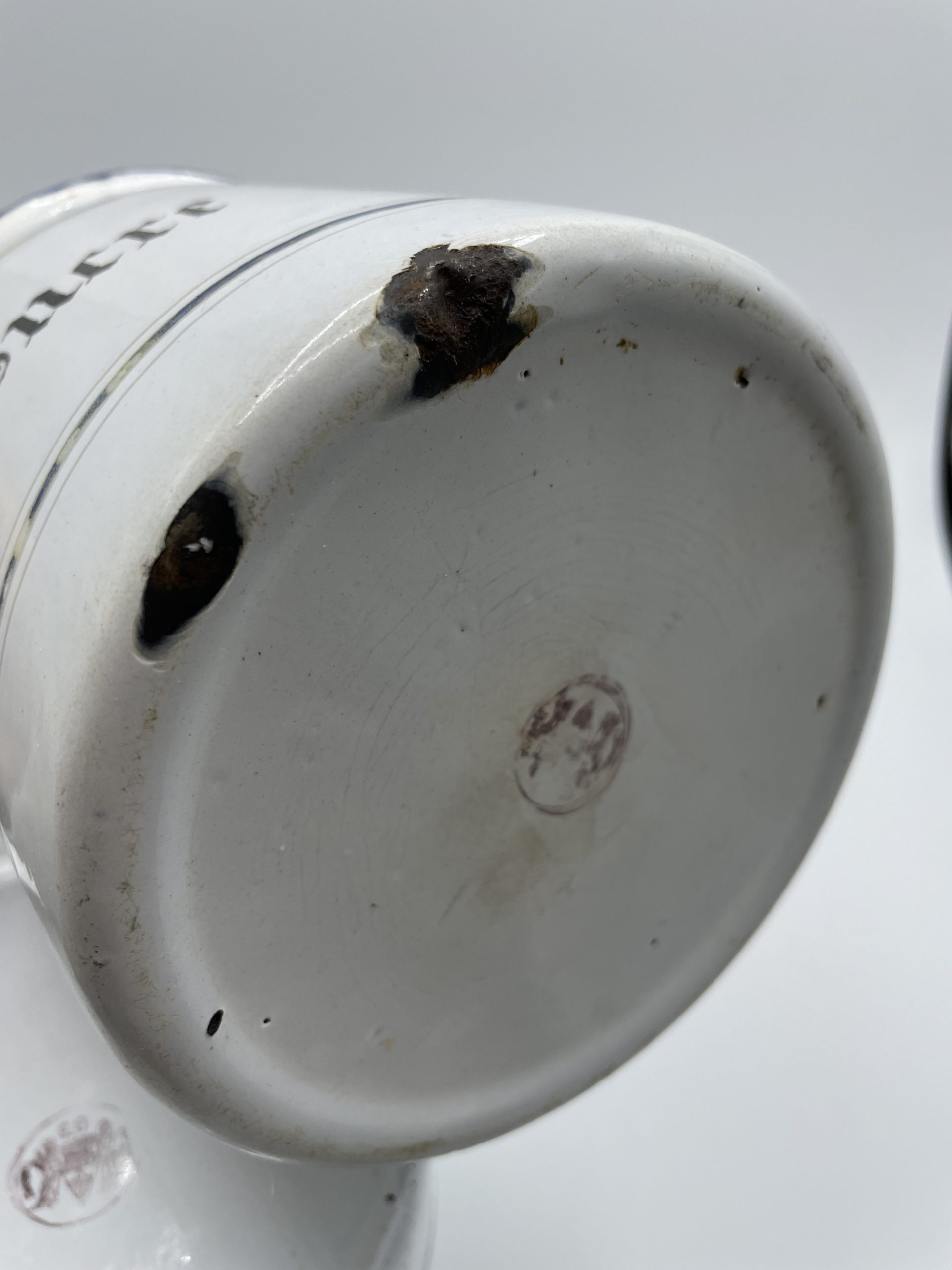 Amoureux de vintage, vous voilà servis ! Ce joli trio de pots anciens en métal émaillé est composé d’1 pot à sucre, 1 pot à café et 1 pot à farine. Les pots en tôle émaillée datent du début 20ème siècle, des années 20 30 et ils sont estampillés d’un logo représentant chevaliers en armures qui se tiennent à côté d’un écusson avec l’inscription « marque déposée ». Vintage, de nombreuses marques d’usure sont à prévoir (cf photos)jolies marques du temps passé. Les pots en tôle blanche sont décorés de liserés bleus et portent les inscriptions « Café » « Sucre » et « Farine » en écriture gothique. De très beaux objets qui apporteront une touche de vintage et de rétro à votre intérieur !