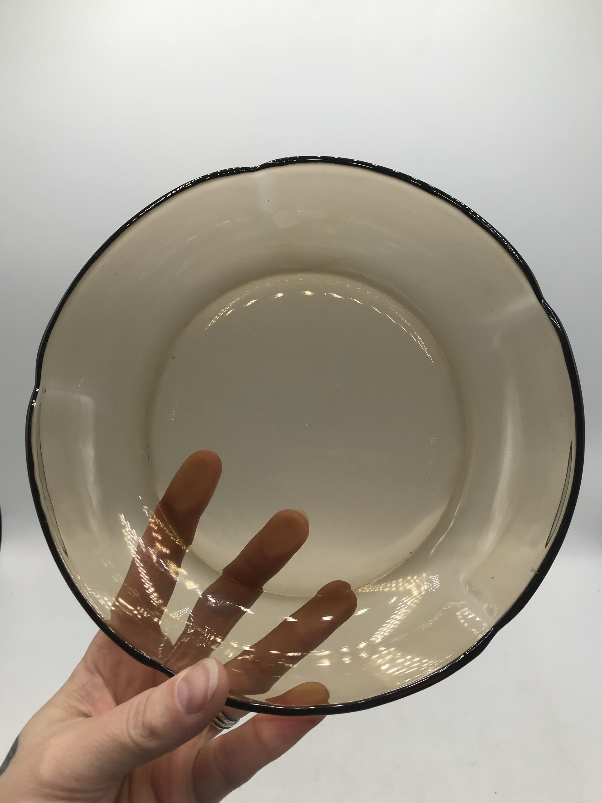 Lot de 4 assiettes Duralex ambrées Brunes. Je craque pour cette vaisselle retro. Ce lot est composé de deux assiettes plates festonnées de diamètre 19 cm sur une hauteur de 2 cm, et de deux assiettes creuses festonnées, de diamètre 19 cm sur une hauteur de 3,5 cm. En très bon état, quelques traces d’usure mais légères. Une vaisselle pleine de charme d’antan pour des moments à deux ou a plusieurs autour d’un bon repas. Belles pièces retro pour une décoration marquée.