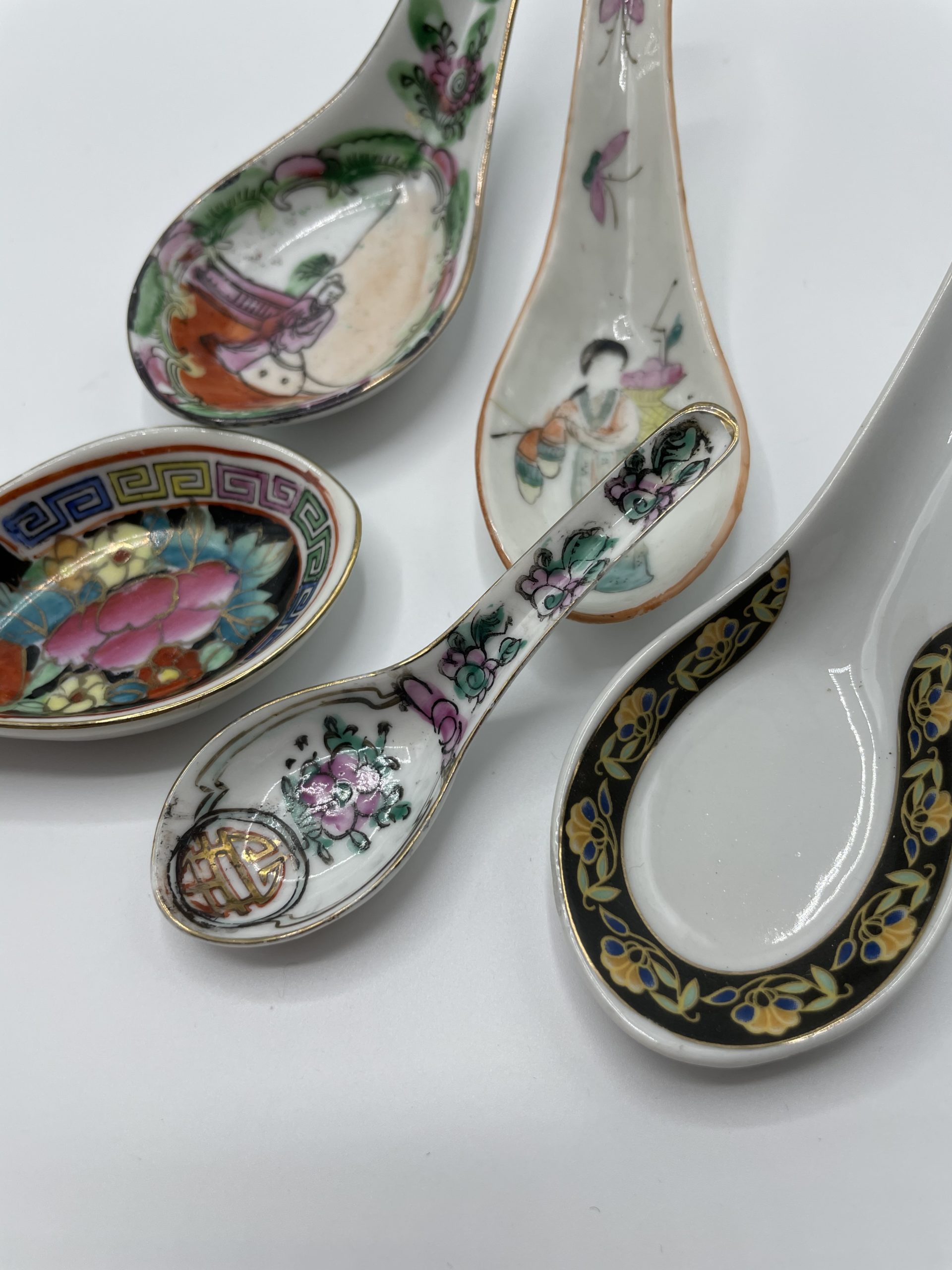 Joli lot de 4 cuillères à soupe chinoises dépareillées. Le lot est composé de 3 cuillères en céramique de taille classique. Et d’une cuillère plus petite peu communes. Une toute noire avec un motif de lotus coloré, une avec un motif de femme pastel. Une avec un motif de personne en tenue traditionnelle agenouillée. Une avec un motif noir avec des fleurs jaunes. Et la petites avec un symbole traditionnel et des motifs floraux roses. Les cuillères sont peintes à la main et sont donc des pièces uniques! A la différence des cuillères occidentales, le fond plat et profond des cuillères chinoises, assure une plus grande contenance et correspond en outre à une gorgée de soupe.