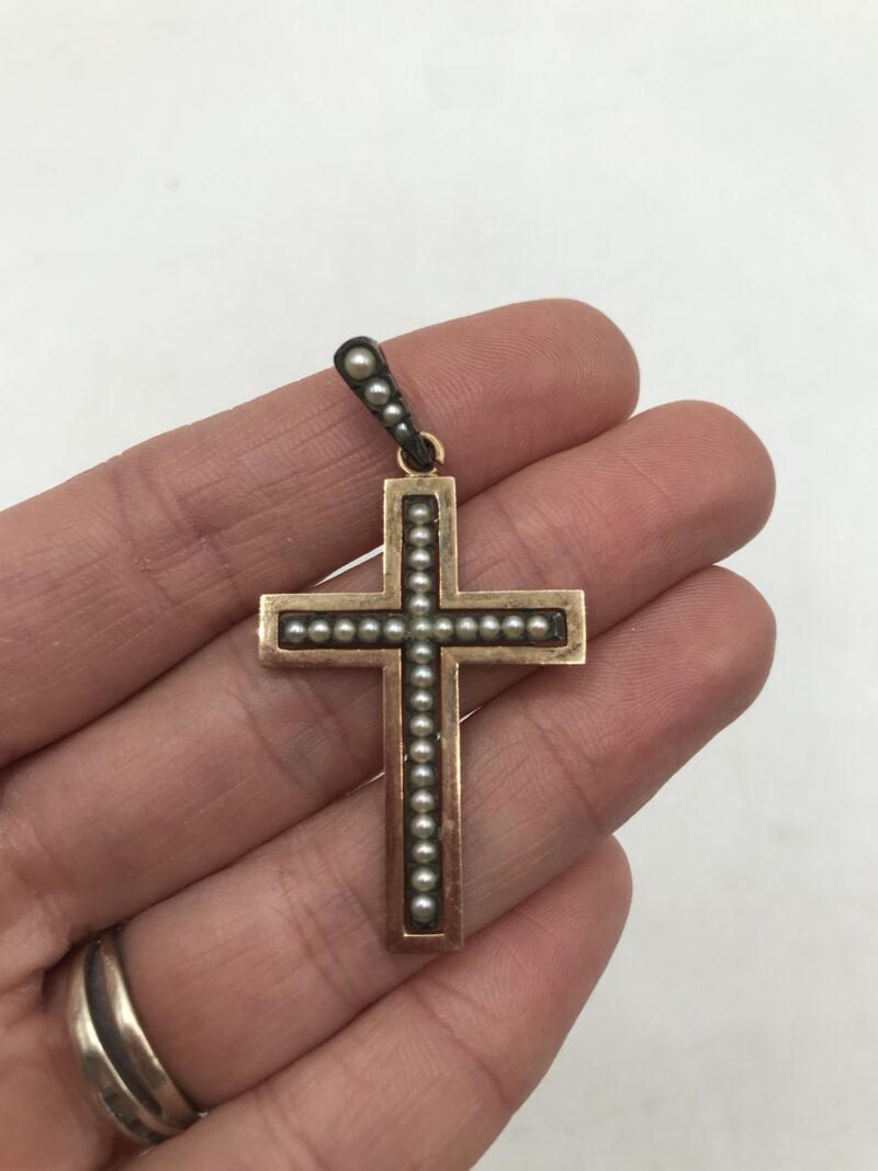 Lot de 4 pendentifs croix vintage. Pour les amoureux de bondieuseries. Vous allez craquer. Ce lot est composé de 4 croix pendentifs. Le premier est très fin comme de la dentelle, joli travail de minutie. le deuxième est décoré de minuscules marguerites un vrai travail dans le détail. Le troisième est en métal doré avec des petites perles blanches et le dernier est assez classique, on y voit le christ sur une croix en métal doré. Bel ensemble qui ne demande qu’a être porté et retrouvé toute sa superbe.