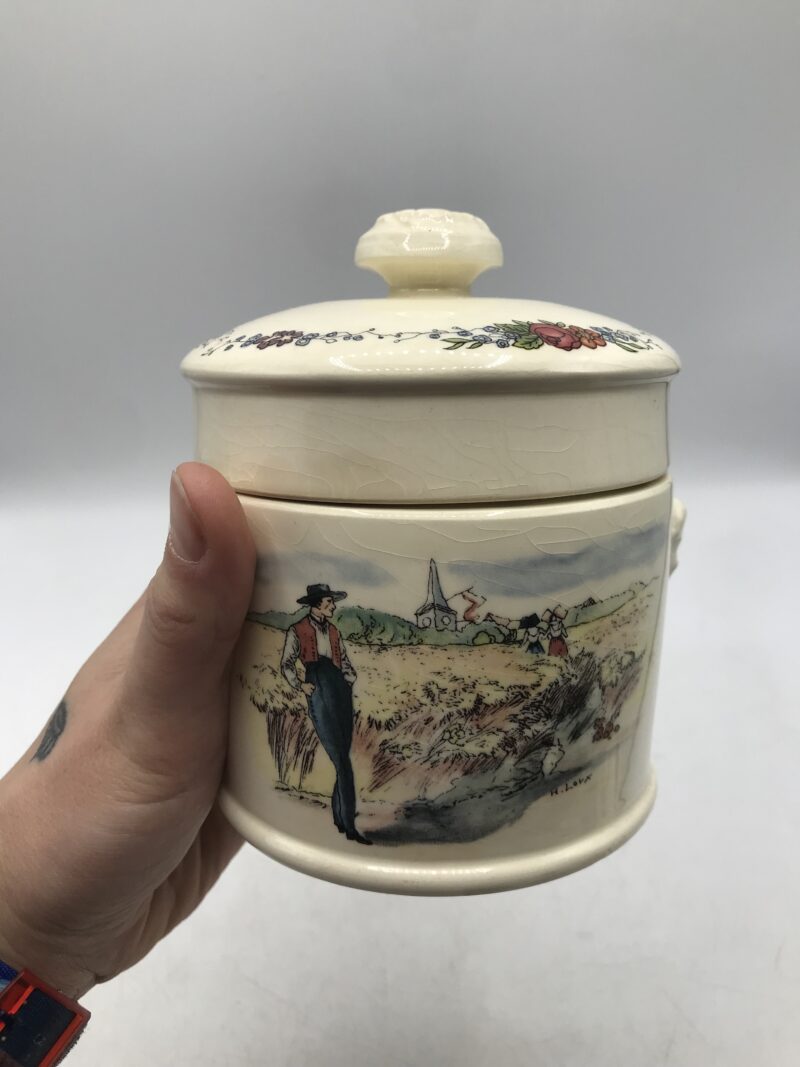 Lot de 4 pots céramique Sarreguemines Obernai. Magnifique lot composé de 4 pots de la collection « Obernai ». Nous avons un premier pot de diamètre 10 cm pour 13 de hauteur avec couvercle. Il est accompagné de deux pots de diamètre 9 cm pour une hauteur de 10 cm avec couvercle. Et pour finir le petit dernier de diamètre 8 cm pour une hauteur de 10 cm. Les pots sont vraiment à croquer et parfait pour une belle déco. A noter des traces de patines et des éclat à l’intérieur du grand pot (cf photos). Parfait pour les amoureux de belle vaisselle ancienne.