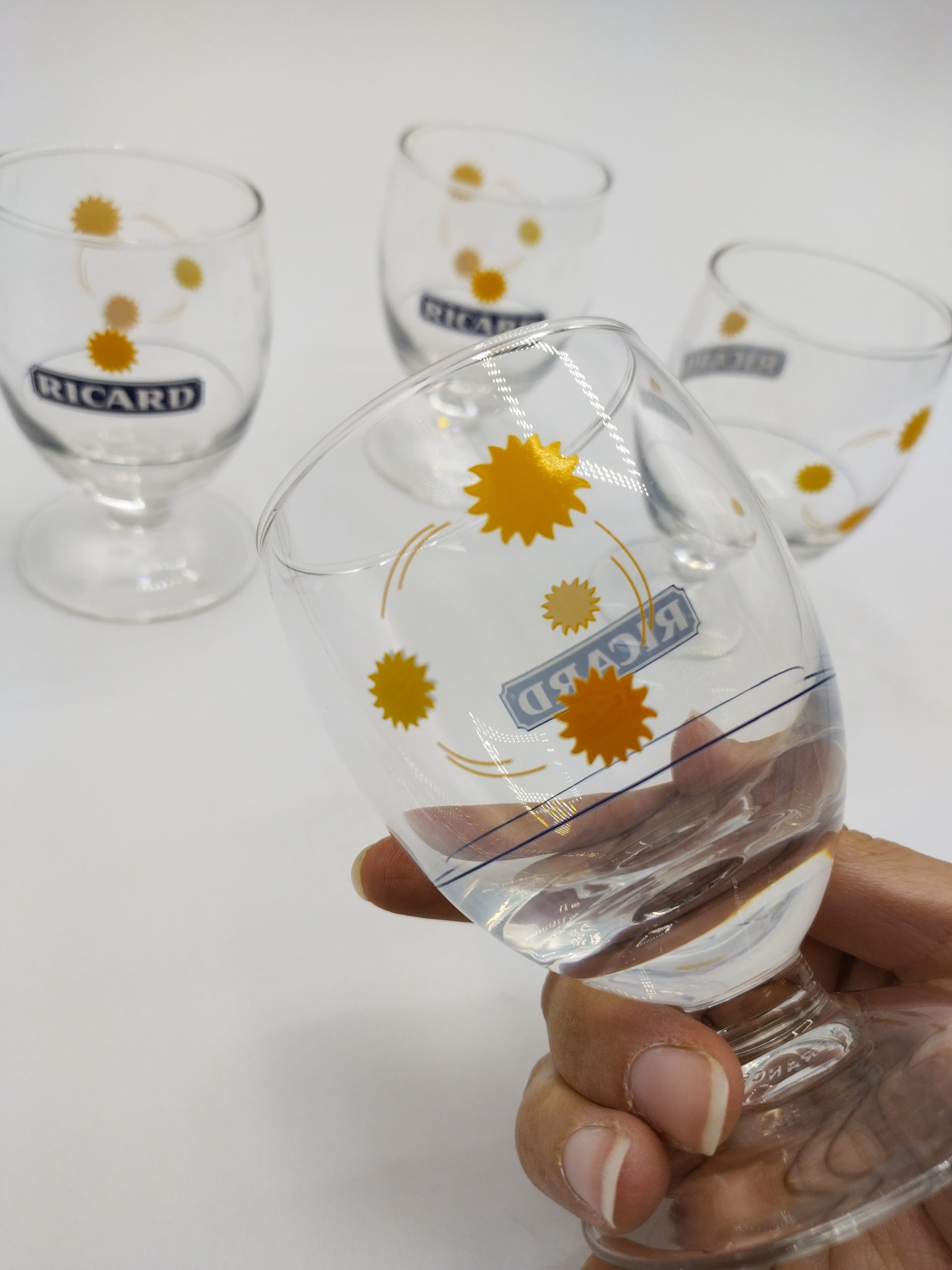 On craque d’amour pour ce joli lot de 4 verres ballons. Produits dérivés de la célèbre marque de pastis Ricard, les verres ballon sot de petites tailles et parfaits pour servir des bibis, des petits pastis pleins d’eau. En verre transparent, ils sont marqués du logo bleu de la marque et décorés avec de petits soleils jaunes et un liseré bleu marine tout fin et ils sont estampillés Arc France. Invitez le sud à l’apéro !
