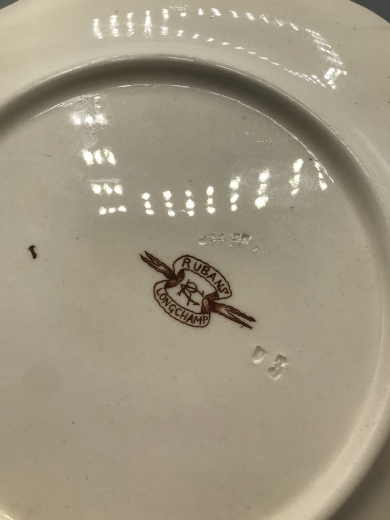 Pour les amoureux de Terre de fer et de vaisselle ancienne. Ce lot est composé de 5 assiettes modèle Ruban Robert fin XIX. De très belles assiettes, motifs marron glacé sur un fond beige, doux à souhait. Les motifs représentent des fleurs et une belle corbeille de fruits au centre de l’assiette. Un ensemble raffiné, délicat pour les connaisseurs. Deux assiettes présentent des éclats (cf photos). Mais elles ont bien traverser le temps et reste en bon état.