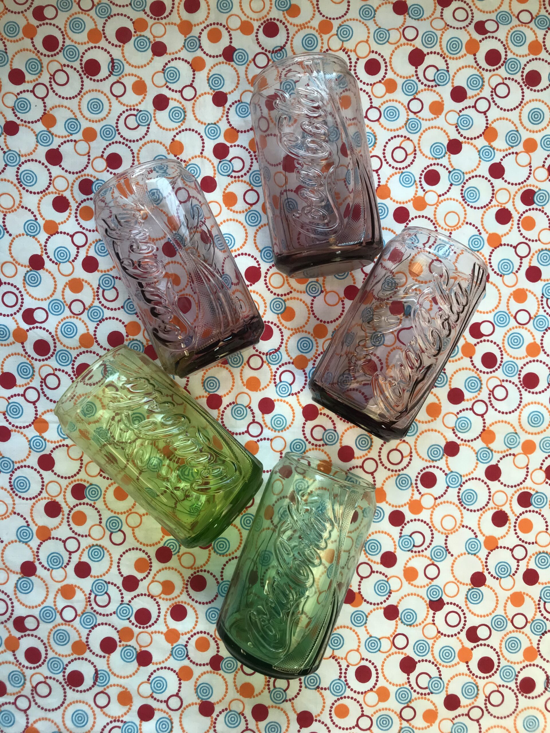 Lot de 5 verres Coca-Cola vintage. Joli lot composé de 5 verres pour la marque Coca-Cola, les verres sont un état proche du neuf (cf photos). Nous avons 3 verres violet, un verre turquoise et un verre vert. Ces verres étaient distribués sous l’enseigne Mc Do. Ils ont une forme de la fameuse canette de Coca. Verres déco pour les nostalgiques et les collectionneurs, apportez votre touche vintage et colorée sans retenue. Mettez du pep’s sur votre table vous allez séduire vos invités de toutes les générations. Des objets publicitaires qui traversent le temps sans vieillir. Always Coca-Cola !!!!