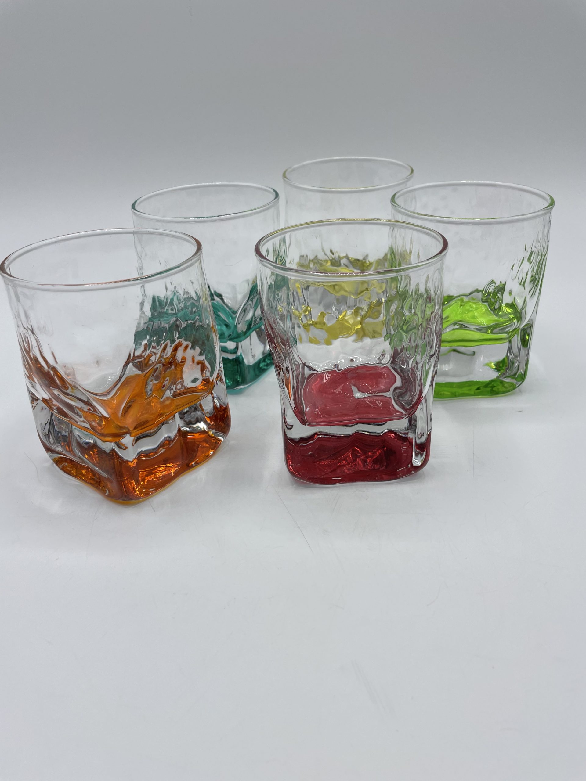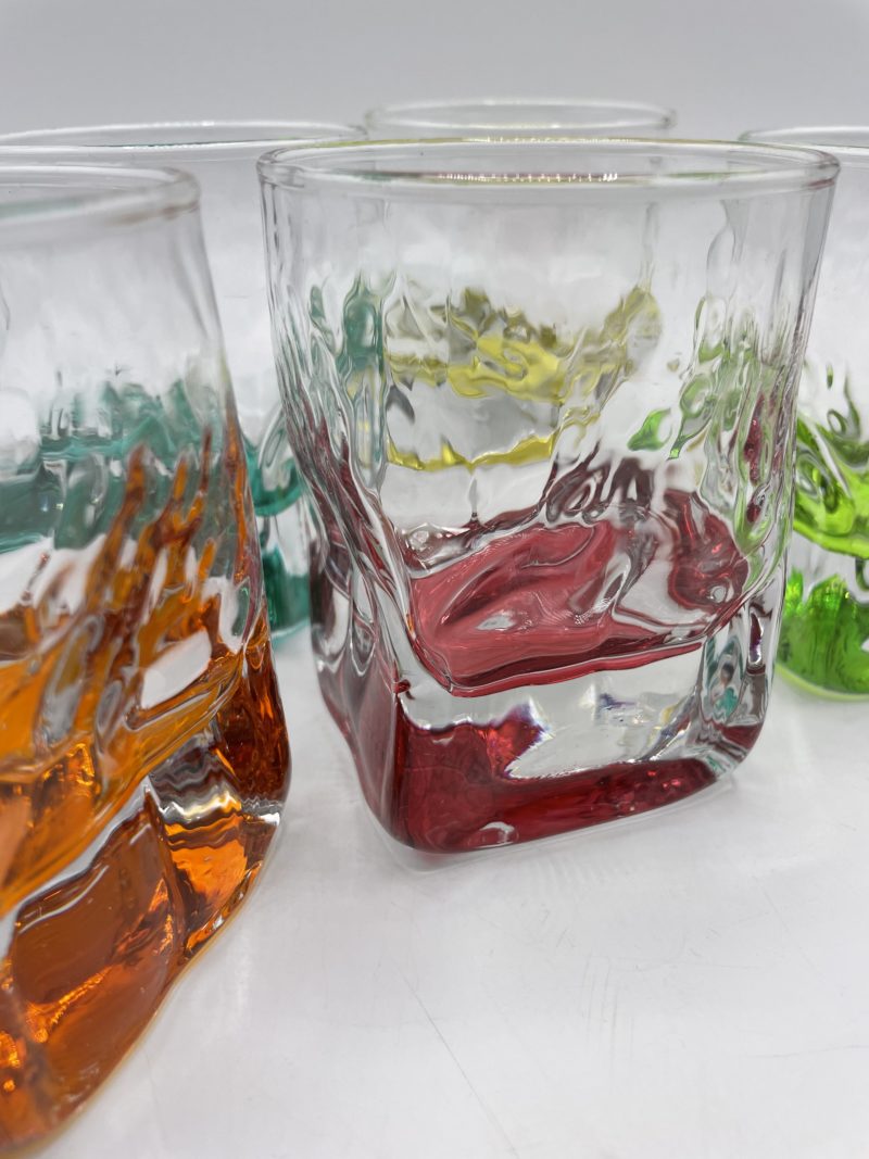 Ce joli lot se compose de 5 verres style verre à whisky. Les verres en verre transparent ont un effet martelé et ils ont des creux près de la base qui permettent une meilleure prise en main. Les verres sont peints à la base avec une fine couche de peinture de couleur qui leur donne une jolie teinte. Les verres sont de couleur jaune, orange, framboise, vert pomme et vert menthe. Idéal pour servir des cocktails ou des sirops assortis aux verres !