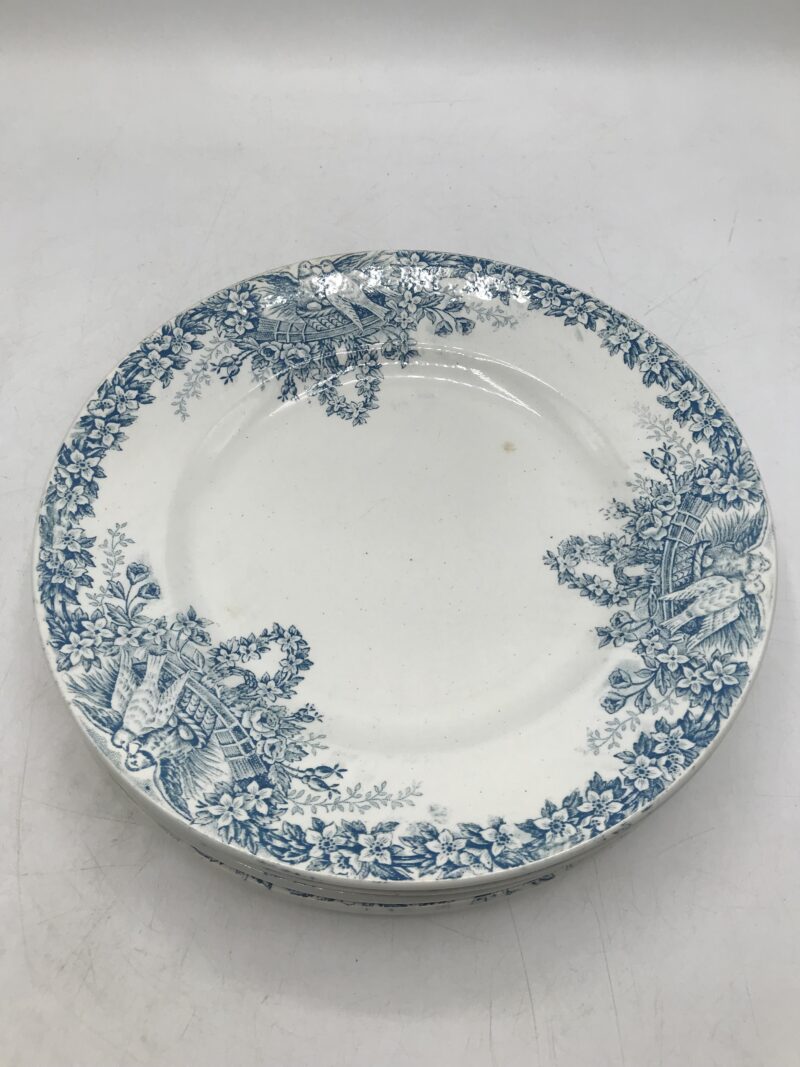 Alerte pépite !!! Lot de 6 assiettes Saint Amand « Colombier ». Merveilleux lot de 6 assiettes Terre de Fer. Collection « Colombier » on craque pour cette collection, nous y voyons des nids de colombes, la femelle qui couche et la male qui apporte la nourriture. D’un bleu clair ses assiettes mêlent douceur et poésie. Les assiettes ont un diamètre de 23,5 cm pour une hauteur de 2 cm. Les assiettes sont en bon état mais présentes des marques d’usure liées au temps, les dessins sont usés à certains endroits. Une vraie valeur sure de vaisselle ancienne. Elles donneront du charme, de l’élégance à vos tables, vos convives seront séduis.