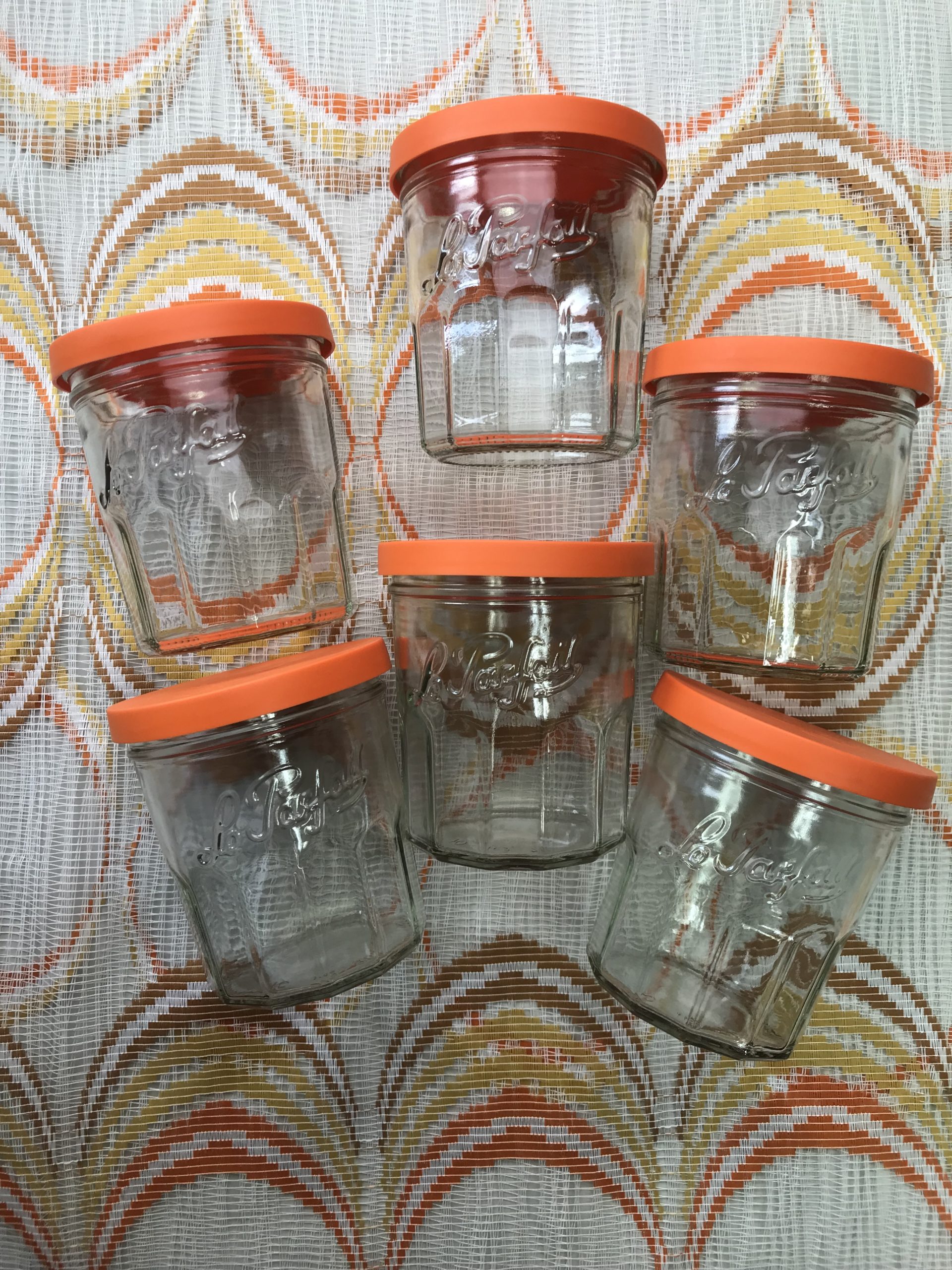 Un superbe lot de 6 confituriers Le parfait. Ces bocaux en verre ont une contenance de 445 ml, ils ont de magnifiques couvercles orange vintage. Rien de tel pour conserver toue la saveur des fruits de saison fraichement cueillis. Une idée pratique et déco, avec leur couleur ils apporteront du peps. Ils ont un diamètre de 8,5 cm pour 9,5 de hauteur. Il sont dans un état parfait, rien à rajouter sur eux.