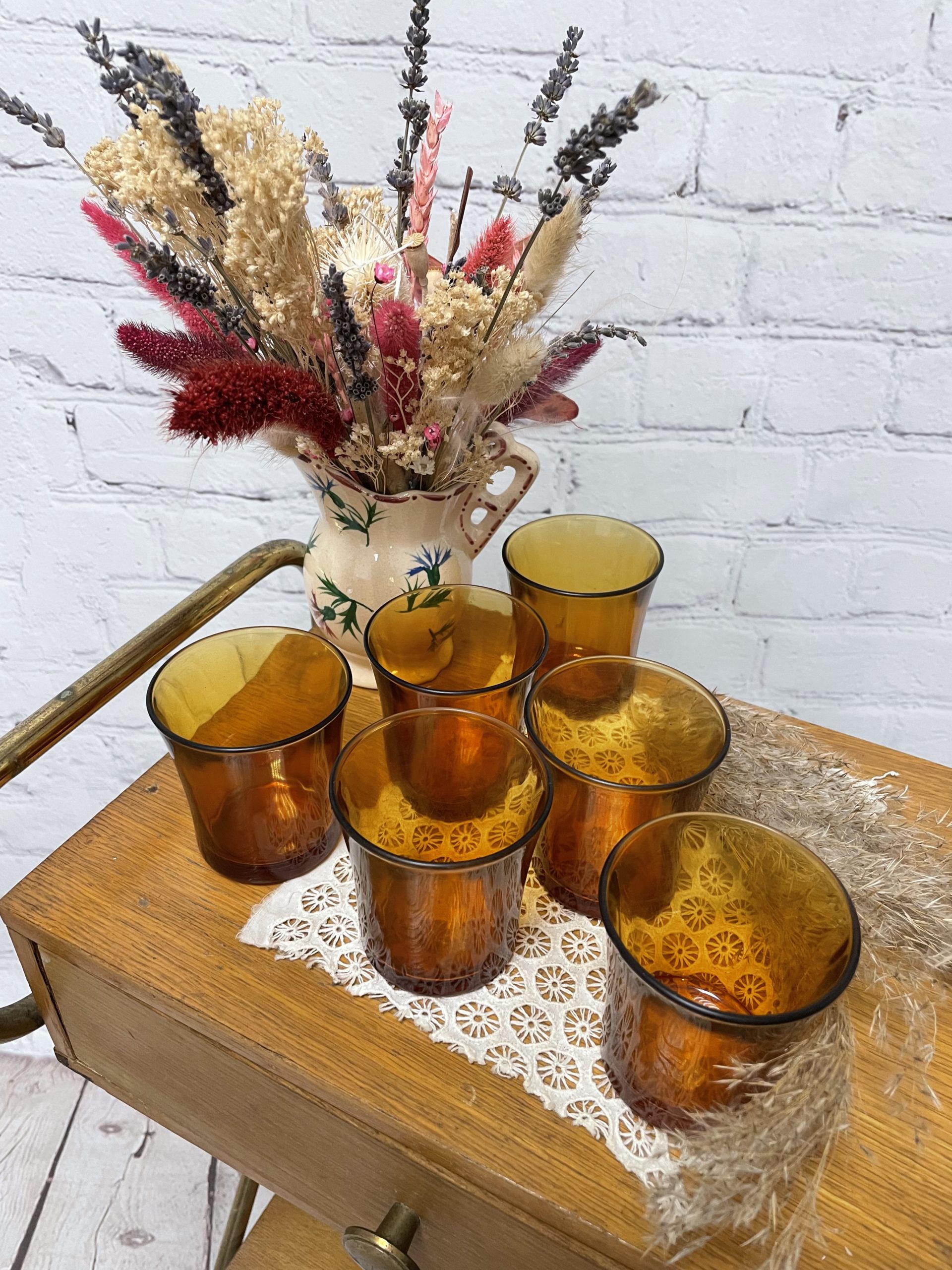 On craque d’amour pour ce joli lot de 6 gobelets à eau. En verre de couleur ambre, les verres sont estampillés Duralex France.Vintage, les gobelets présentent des traces d’usure (cf photos) jolies marques du temps passé. De jolis gobelets vintage qui vus rappelleront vos années à l’école primaire et qui seront parfaits pour une jolie table au style rétro années 70 !