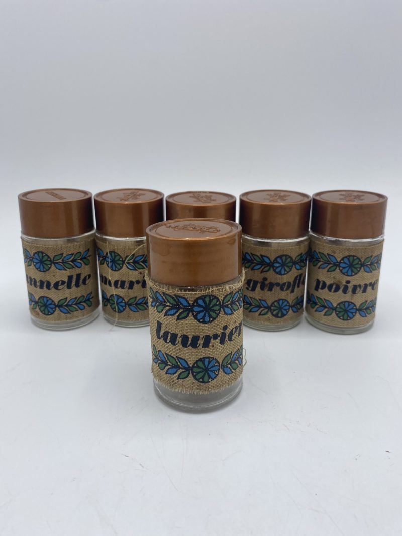 On craque d’amour pour ce joli lot qui se compose de 6 petits pots en verre. Les pots de forme cylindrique se ferment grâce à leurs bouchons hermétiques en plastique de couleur bronze. Les bouchons sont marqués de la célèbre marque Nestlé avec le logo emblématique des oiseaux dans le nid, et un bouchon est marqué Nestea. Le spots ont décorés avec de la toile de jute sur laquelle sont peints des motifs de frises bleues, vertes et noire. Sur les étiquettes on lit laurier, girofle, romarin, poivre et cannelle et sur l’un des pot l’inscription d’origine a été effacée au blanco et remplacée par l’inscription manuscrite muscade. De jolis petits pots parfaits pour la cuisine ou pour tout autre rangement !