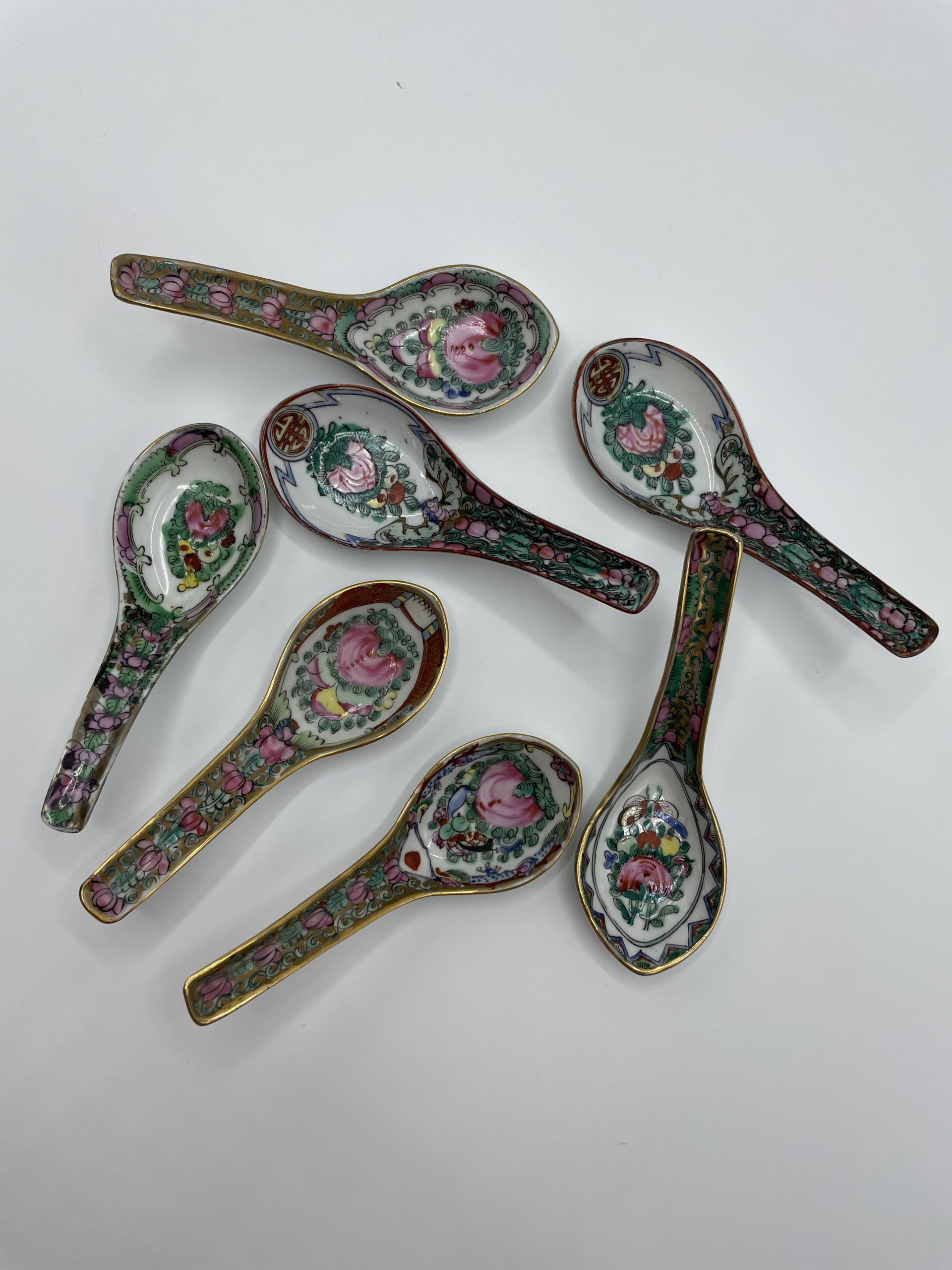 Joli lot de 7 cuillères à soupe chinoises traditionnelle dans le style de Canton avec des motif floraux chargés et colorés, peu communes. Les cuillères sont peintes à la main et ce sont donc des pièces uniques ! A la différence des cuillères occidentales, le fond plat et profond des cuillères chinoises, assure une plus grande contenance et correspond en outre à une gorgée de soupe.