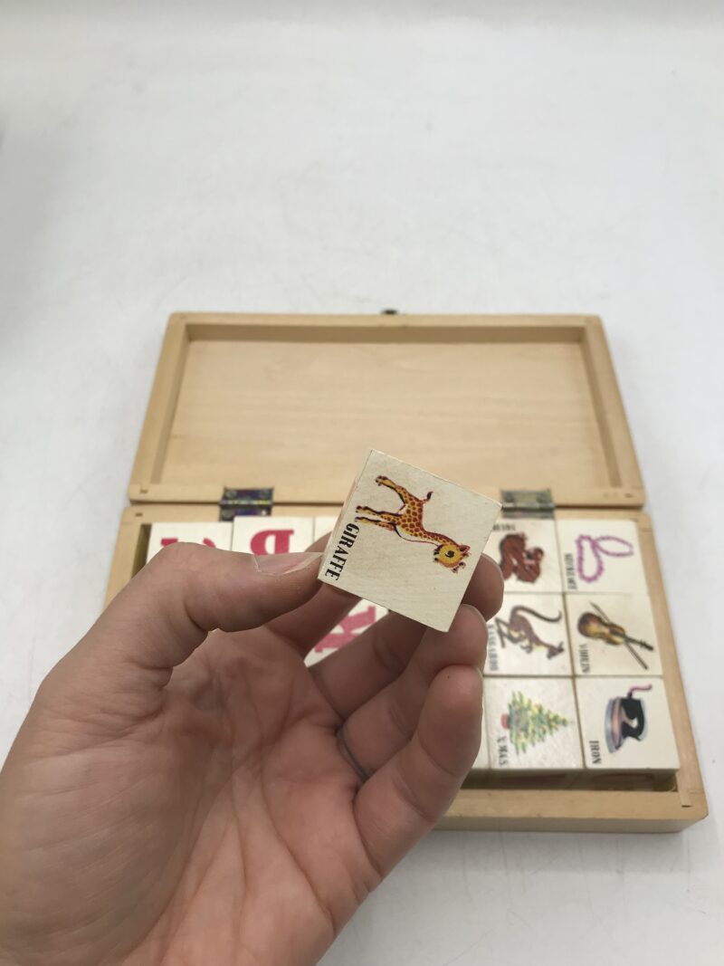 Ce lot est composé de 3 jeux de dominos, un sur le thème Loto des fruits et deux exemplaires thème Loto des animaux. Nous avons également le jeux iconique Le cochon qui rit, une pure pépite !!! Il y a aussi un jeu de Dominos, un jeu de Diamino, et un petit jeu de cubes.