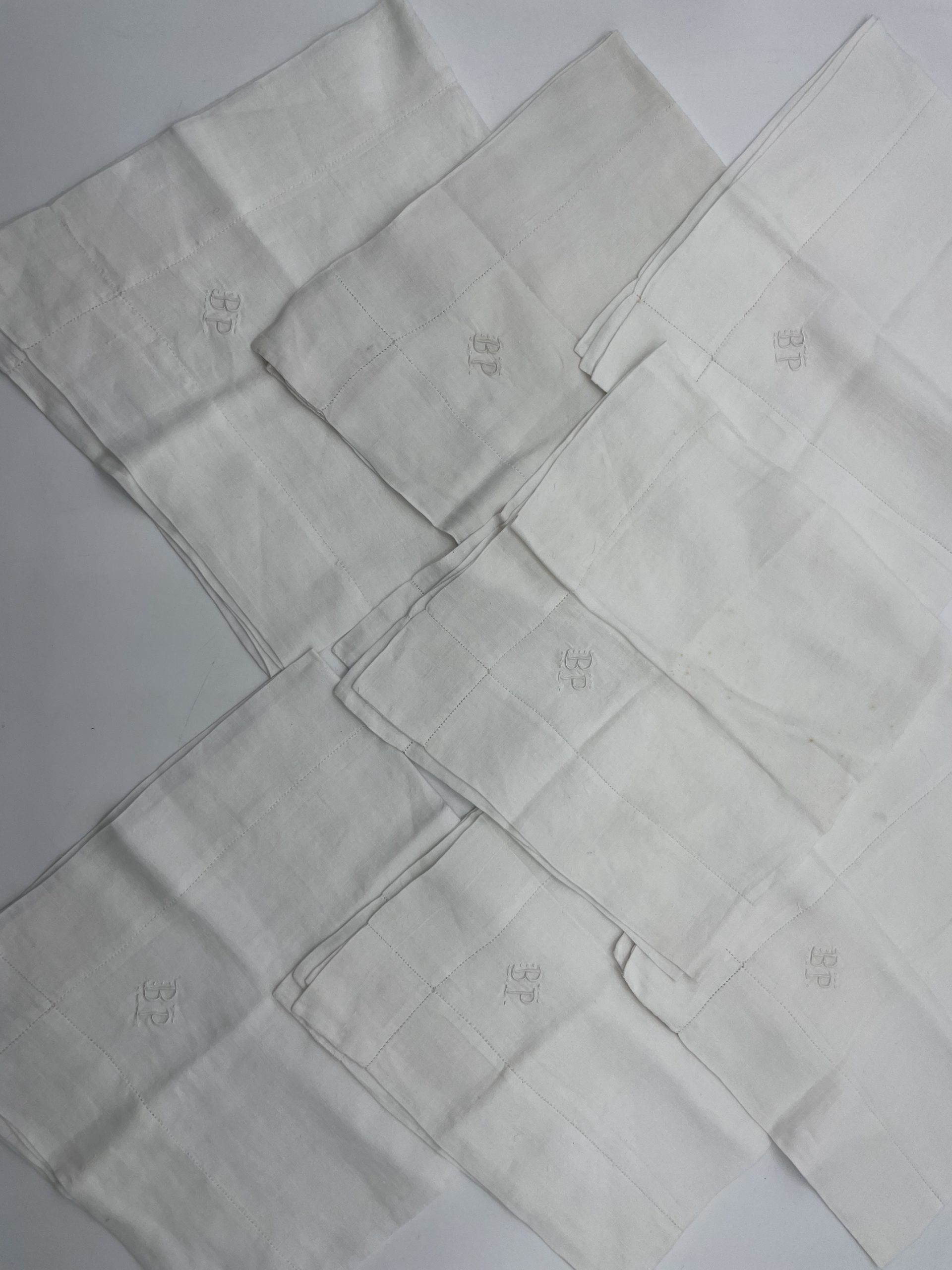 On craque d’amour pour ce joli lot de 7 serviettes de table carrées vintage. En coton léger, les serviettes sont très élégantes et présentent un travail minutieux de broderie. Chaque serviette est brodée avec les initiales B et P. Vintage, quelques tâche sont à prévoir (cf photos) jolies marques du temps passé. Un joli lot vintage et intemporel qui embellira une jolie table !