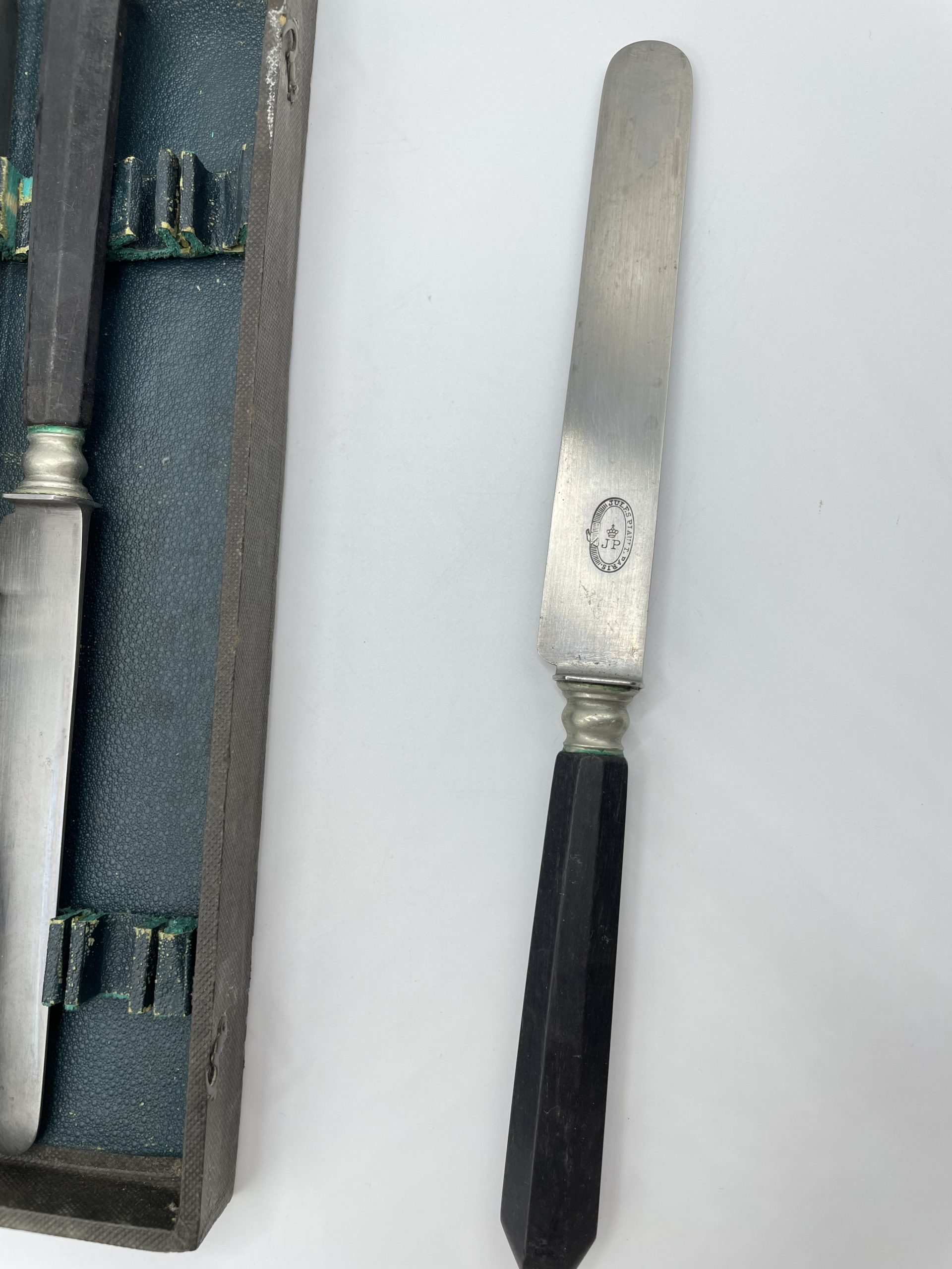 Joli lot de 9 grands couteaux signés Jules Piault Pari. Vintage et à l’esprit rétro, ces couteaux ont un manche en bois et leurs lames sont en acier. Présentés dans leur boîte vintage d’origine, quelques traces sont à prévoir jolies marques du temps passé. Ces couteaux apporteront un charme certain champêtre ou bistro à votre table pour recevoir vos invités dans les règles de l’art.