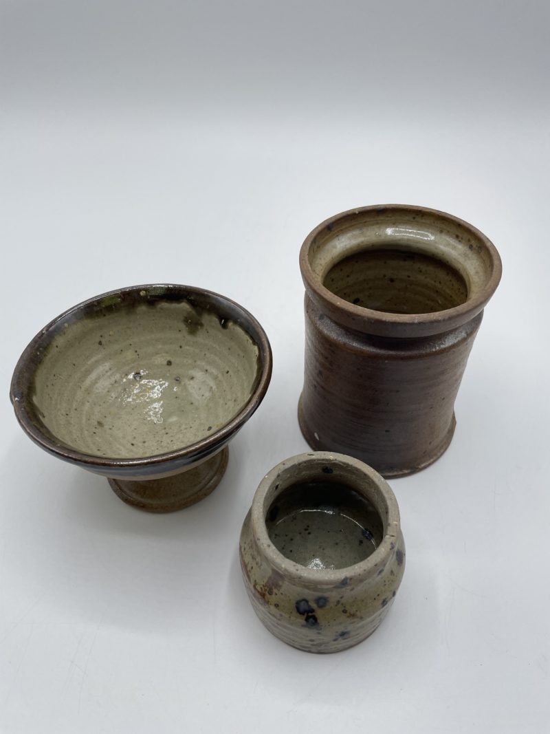 Ce joli lot de 3 pièces se compose d’1 bol sur pied, d’1 grand pot cylindrique et d’1 petit pot en grès. De fabrication artisanale, chaque pièce est une pièce unique. Vintage, quelques traces d’usure sont à prévoir (c photos) jolies marques du temps passé. En grès, les pots et le petit bol ont une jolie couleur naturelle entre le beige et le vert amande et ils sont tachetés, signature propre au grès. Un joli lot parfait pour décorer votre cuisine et vous servir pour ranger vos épices, vos ustensiles ou vos céréales, ou encore comme beaux objets de décoration détournés en pot à crayon, bougeoir ou tels quels !