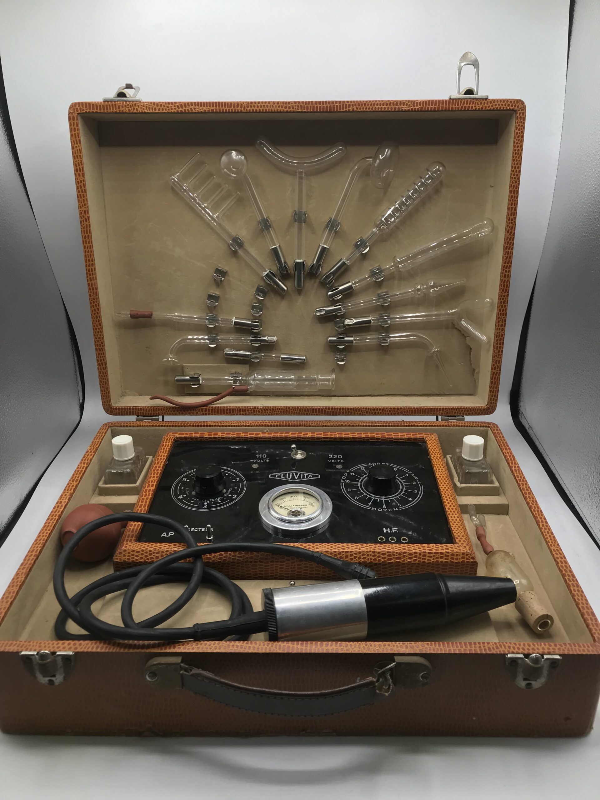 Alerte pépite !!! Malette coffret FLUVIA appareil électro-médical. Ce coffret des années 40 était vendu comme un appareil électro-médical qui utilisait les courants de haute-fréquence et les rayons ultraviolets pour « guérir par l’électricité ». Le slogan de la marque en dit long : « Dans votre intérêt, exigez un FLUVITA. Recommandé par les spécialistes les plus autorisés… » La question étant de savoir si les dits spécialistes étaient des bonimenteurs ou des médecins de campagne autoproclamés… Véritable objet de cabinet de curiosité ce coffret est très atypique. Il est dans son jus, il manque quelques accessoires, la mallette est abimée (cf photos), les traces du temps. Mais l’objet reste en bon état au niveau des accessoires, évidement non testé. Un bel objet atypique et un peu mystérieux.