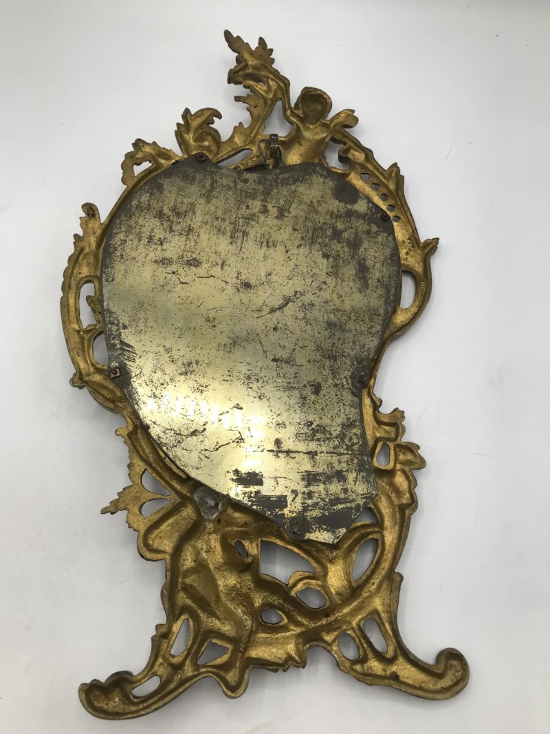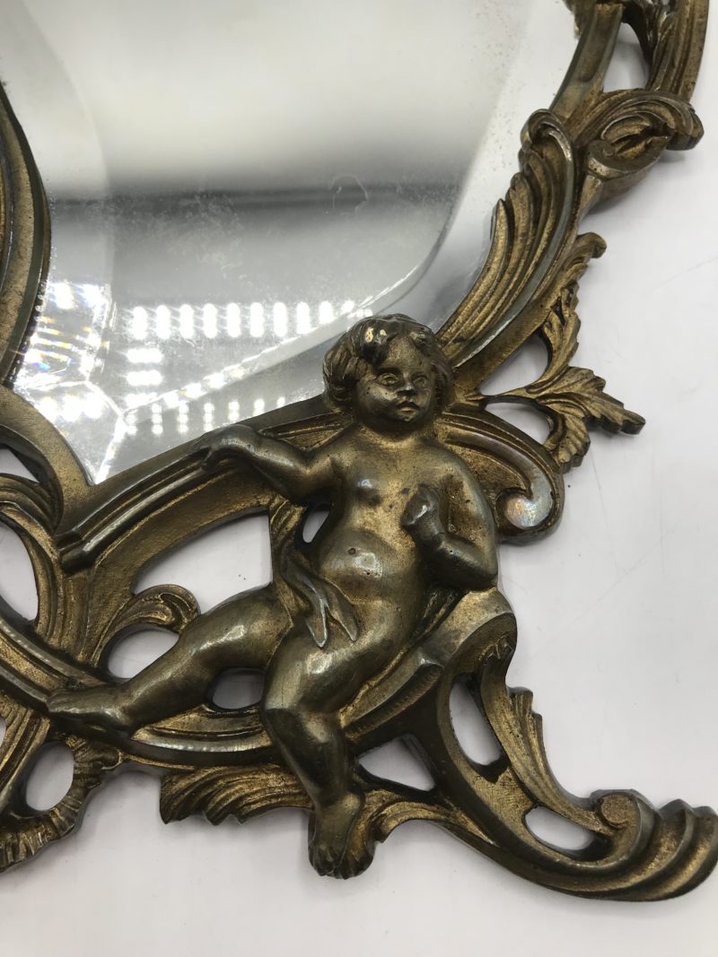 Pour les amours des anciens miroirs. Cette pièce est pour vous !! Une belle note du temps passé, ce miroir est en bronze, il est orné de deux angelots, un en haut et un en bas. Il à des courbes harmonieuses et douces. Parfait pour une ambiance baroque. Les angelots et le décor floral sont en bronze. Le miroir à quelques traces du temps dans la partie « miroir » mais hormis cela il est en bon état. Le miroir mesure dans sa totalité 42 cm de hauteur pour 22 de largeur. Et la vitre seule mesure 21 cm de hauteur par 15 cm de largeur.