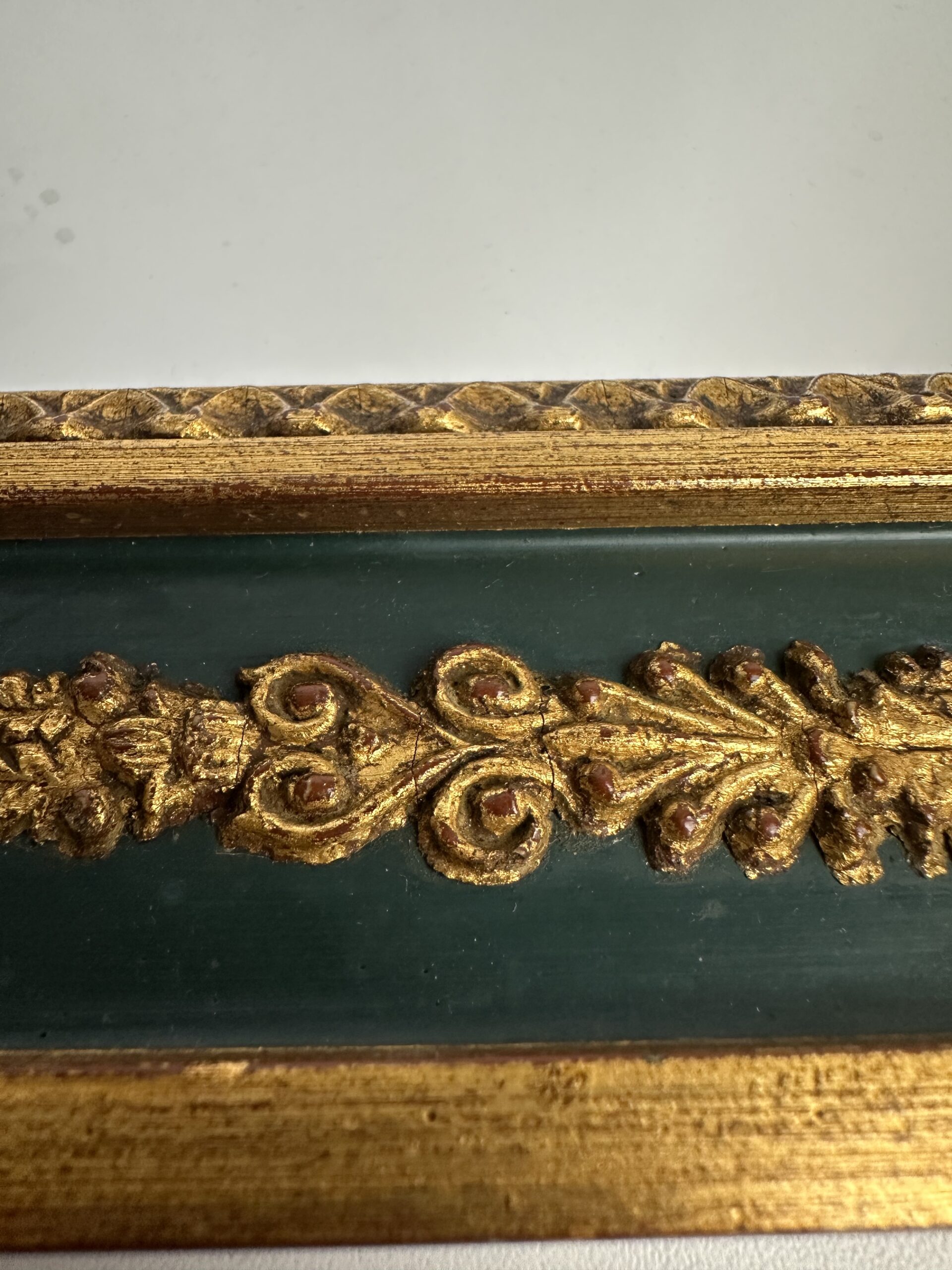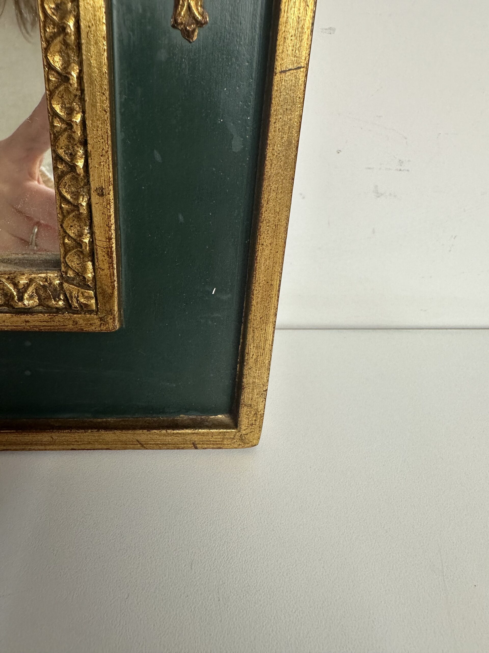 Ce magnifique miroir est en bois. Son cadre est peint dans un vert profond sublimé par de délicates dorures sur les bordures mais aussi sur des jolis détails travaillés en reliefs. Il est en très bon état général. Il n’y a pas de casse ou d’éclats que ce soit sur le cadre ou sur le miroir. Seule la peinture est patinée, et un peu usée à certains endroits. Pensez à bien regarder toutes les photos.
