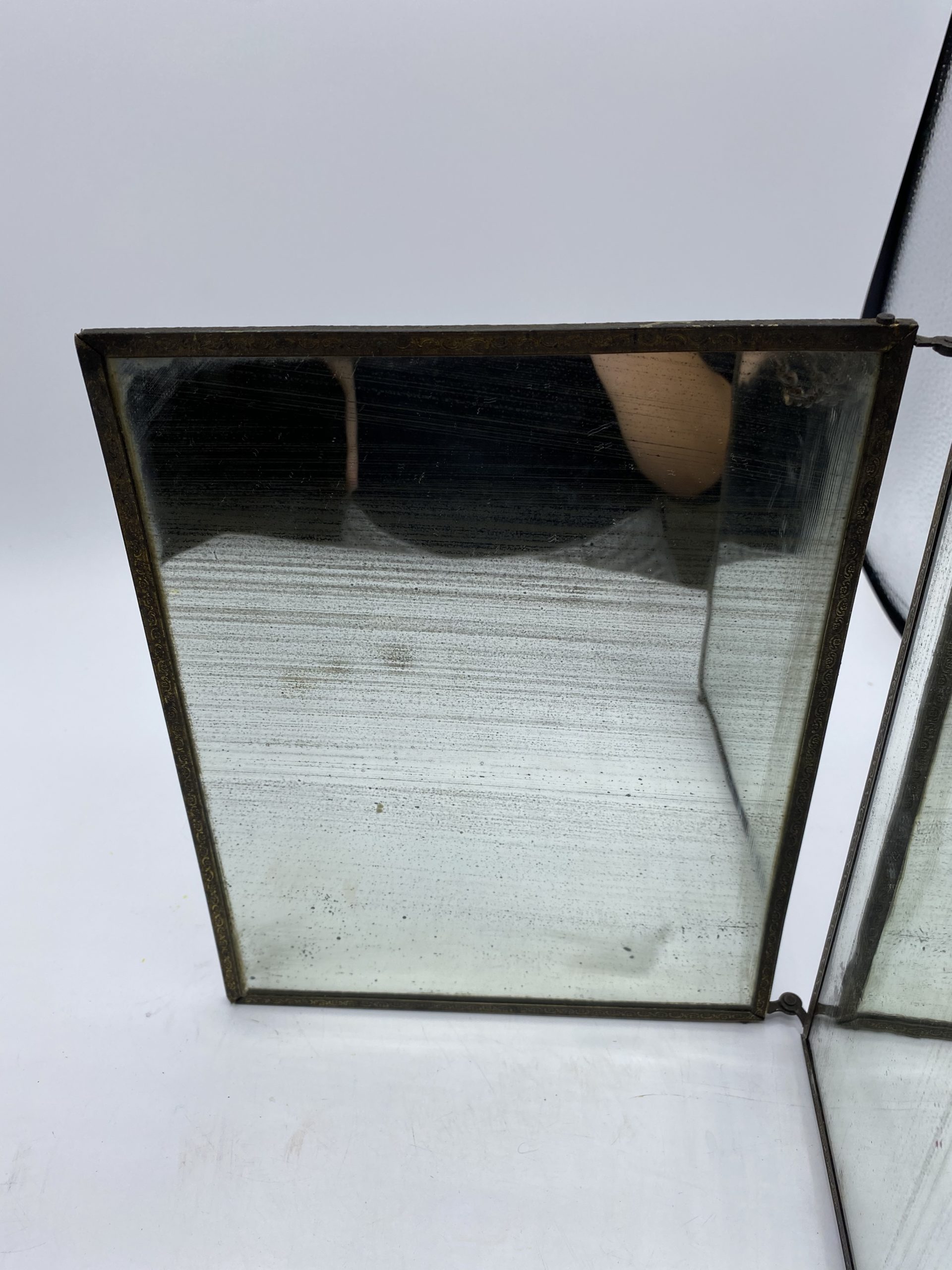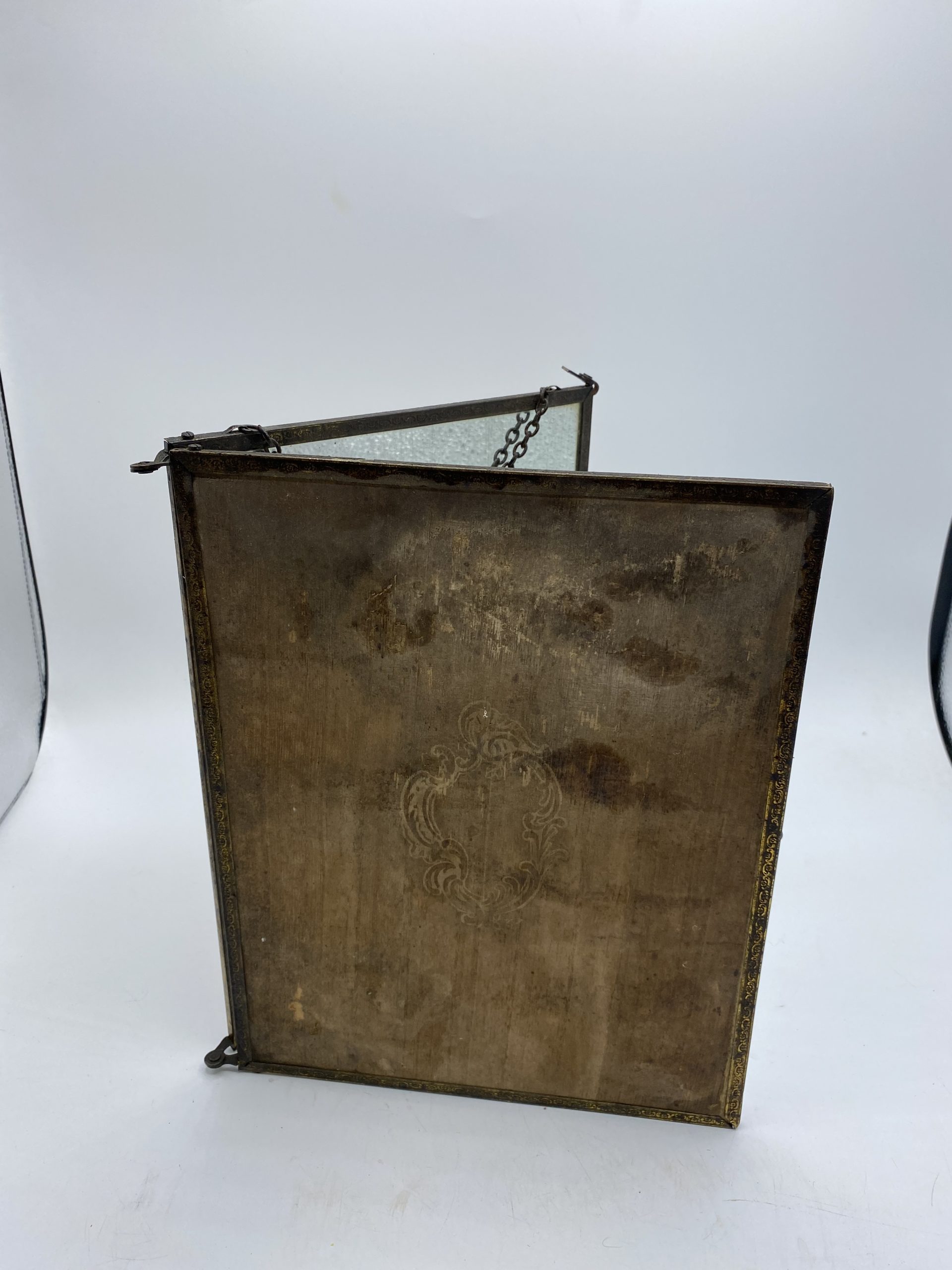 On adore ce magnifique petit miroir de barbier vintage. Ancien triptyque, l’une des glaces s’est décrochée. Le miroir est en métal couleur doré et doublé derrière de panneaux cartonnées avec un motif ornemental. Des années 50, le miroir présente de nombreuses traces d’oxydation sur les glaces et des traces d’usure sur les panneaux (cf photos) jolies marques du temps passé. Parait pour une déco vintage posé sur un joli meuble.