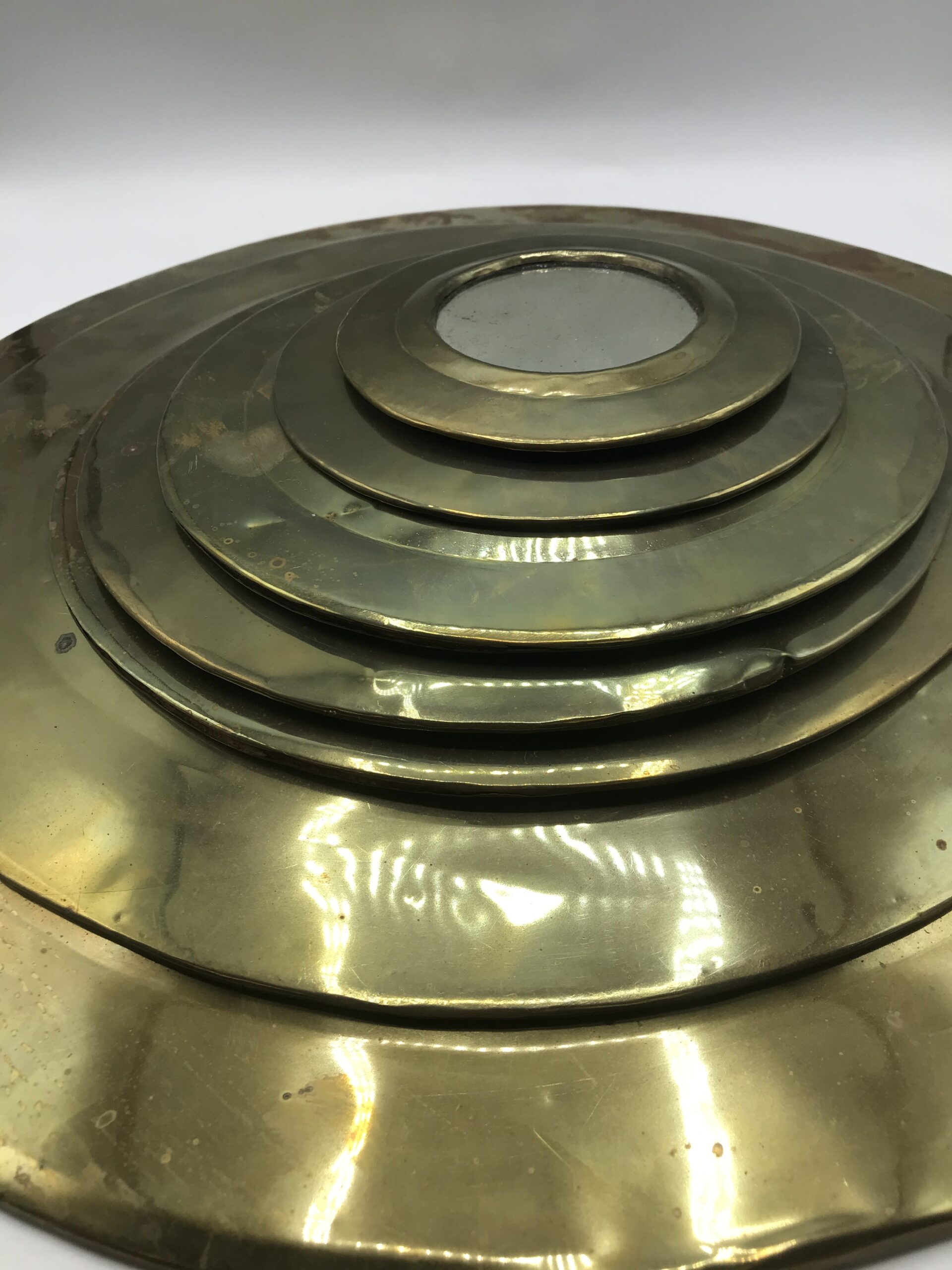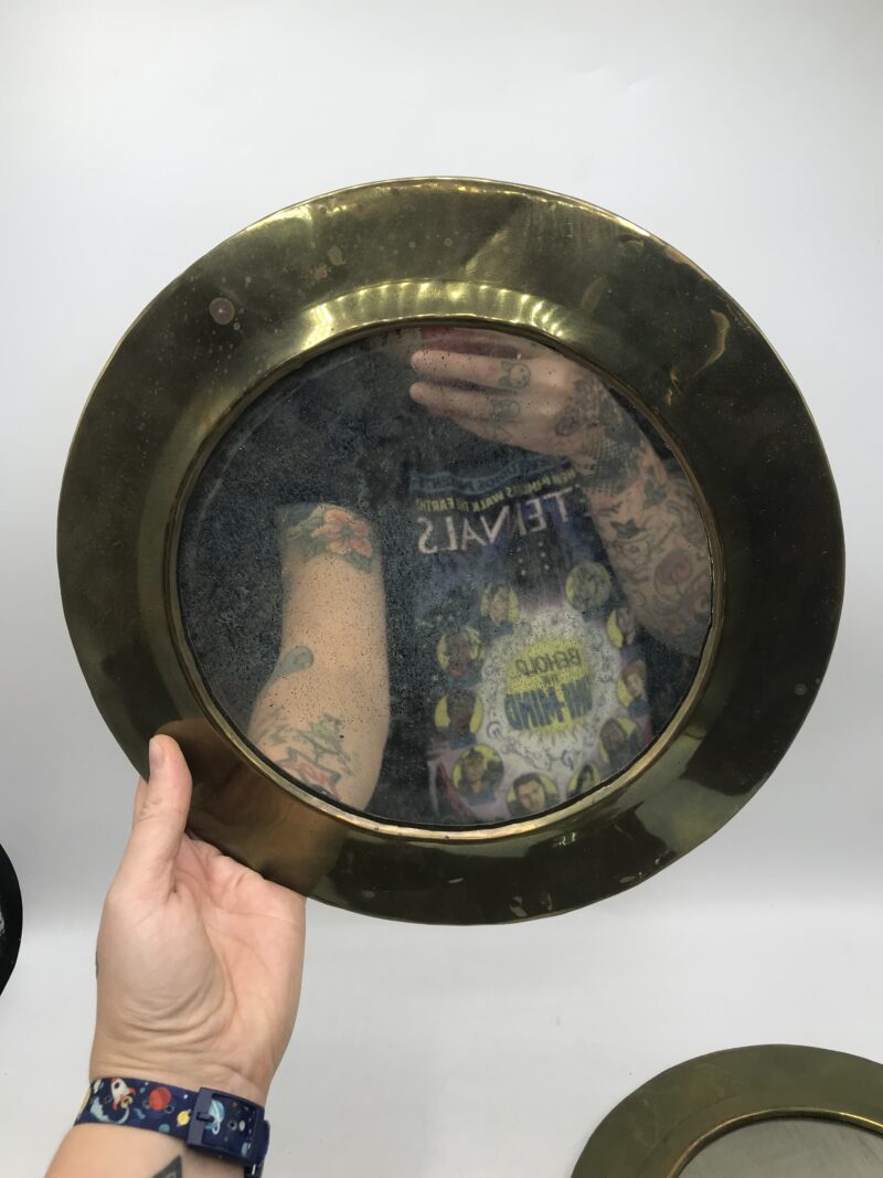 Ensemble de 7 miroirs laiton. Voici un lot composé de 7 miroirs en laiton artisanaux. Ils nous invitent au voyage et à la découverte d’autres cultures. Ces miroirs sont vintage ils portent des marques d’usure (cf photos). A noter les parties miroir sont piquées marques du temps passé et des nombreuses histoires dont ils ont du être témoin. Certaines parties sont décollées et le laiton est marqué, belle patine qui leur donne du caractère. Les miroirs sont de style marocain, leur forme rond peut aussi faire penser à un style nautique. Seule votre imagination peut le décider. Ils ont des diamètres différents le plus grand à un diamètre de 54 cm puis nous avons 43,5 cm, 32,5 cm, 29 cm, 25,5 cm, 19 cm et pour finir 15 cm. Un ensemble idéal pour composer un mur plein de caractère, amateurs de décoration originale et atypique soyez au RDV.