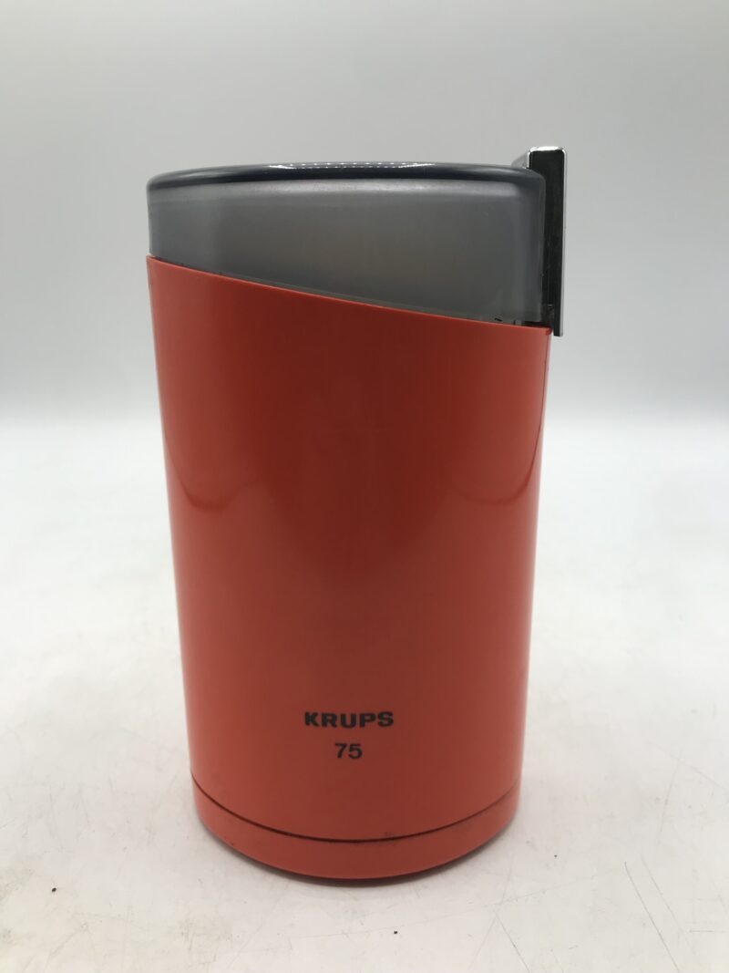 Moulin à café Krups 75 orange vintage. Il s’agit de la version en orange foncé, une couleur typique des années 1970. Magnifique moulin électrique en parfait état de fonctionnement, il à été testé. Il est de forme ovale, il porte quelques traces d’usage mais rien de casser. Un bel appareil vintage qui marche. Une note discrète de couleur dans votre cuisine. Il deviendra vite essentiel à vos préparations. Votre petit café frais du matin sera incontournable. Un petit nettoyage sera nécessaire.