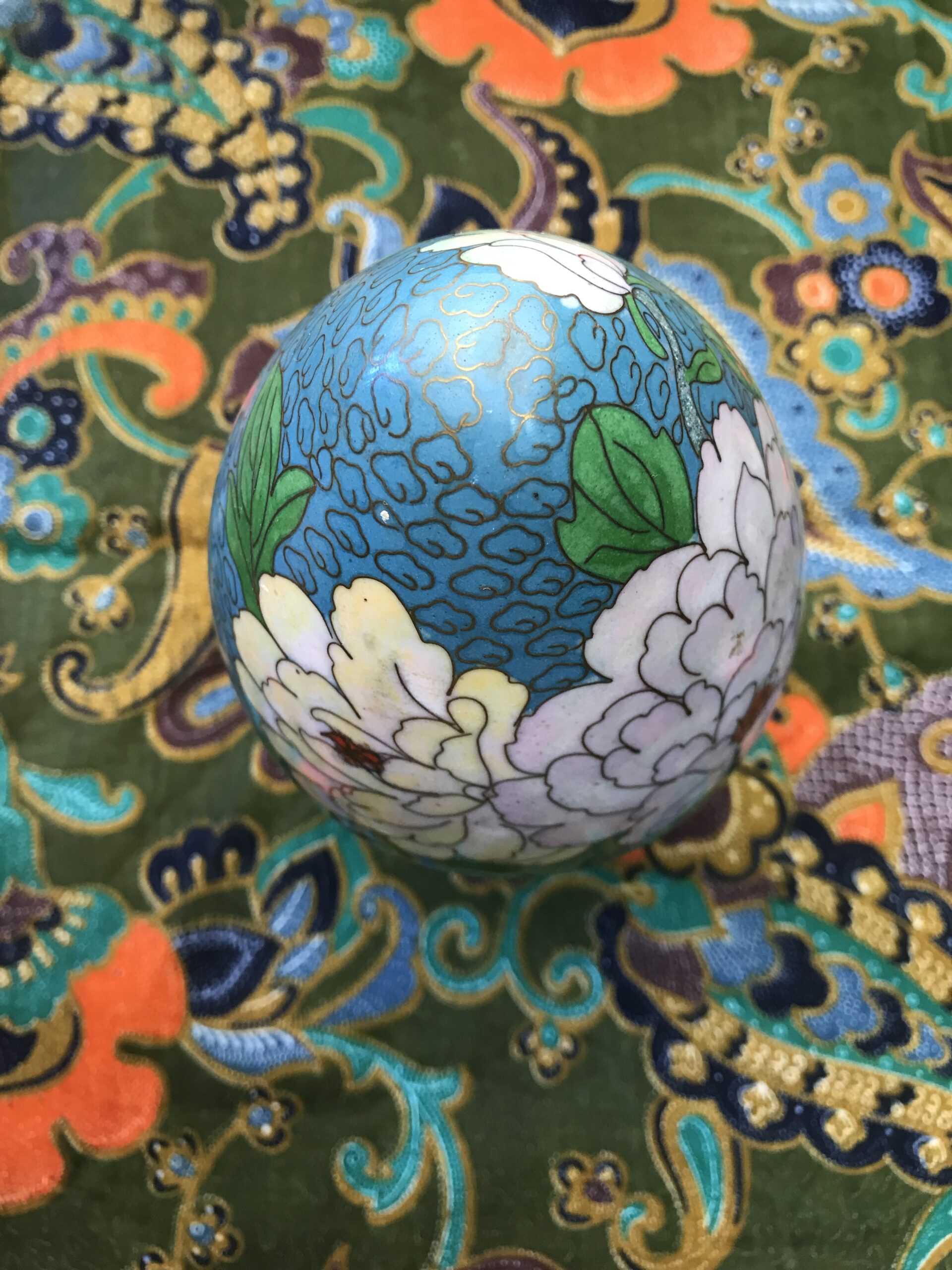 Alerte pépite !!! Magnifique œuf de collection. Il est émaillé cloisonné avec du laiton. Nous y voyons un thème floral, plusieurs superbes pivoines y sont représentées, quelques fleur de cerisier et un petit papillon aux couleurs éclatantes. Une très belle réalisation. L’œuf est dans un très bon état pas de casse. Il est présenté sur un socle en bois traditionnel. Avis aux collectionneurs, ou tout simplement une belle idée cadeau. Il a une hauteur de 17 cm.