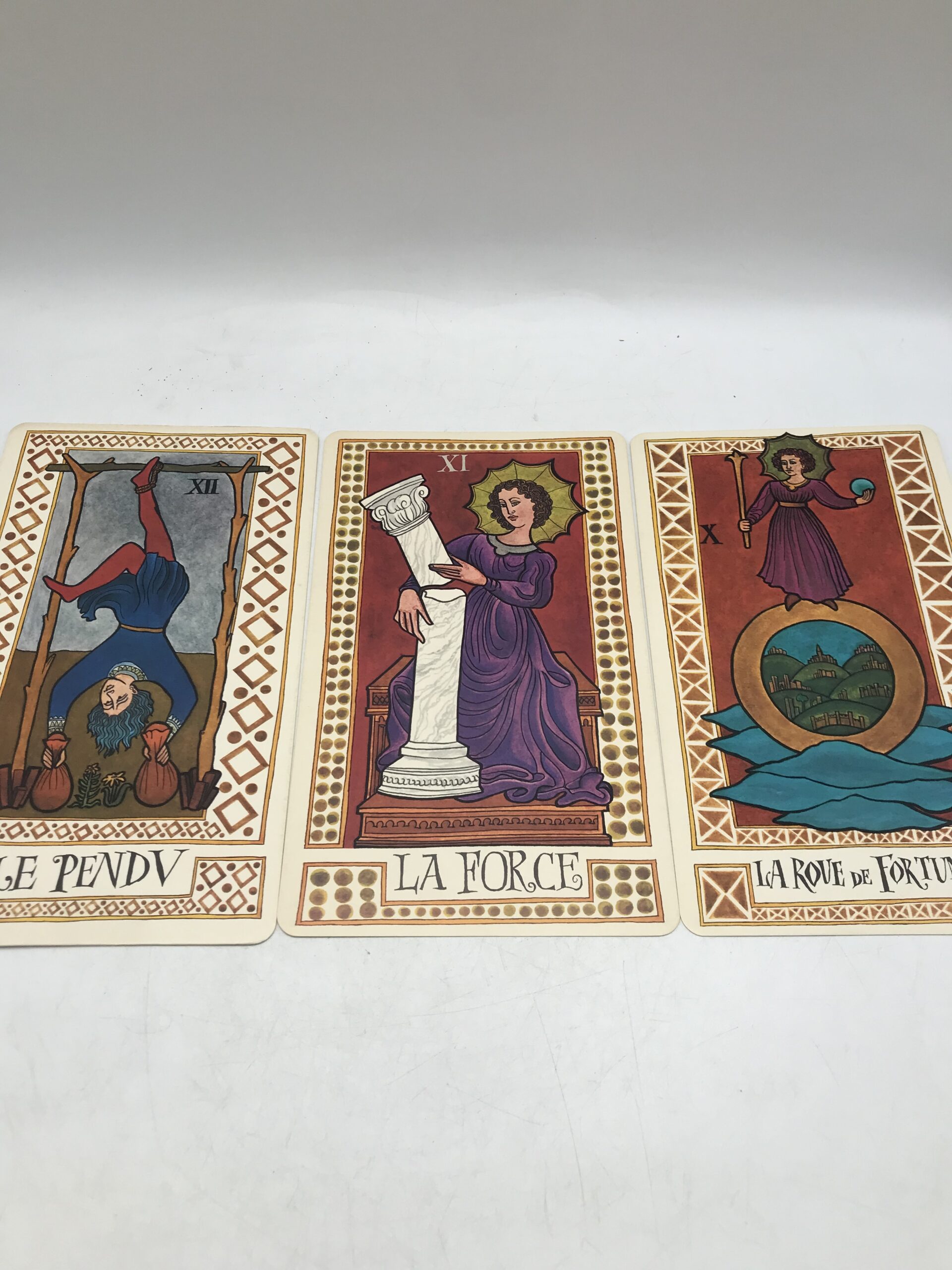 Alerte grosse pépite !!! Jeu oracle tarot Le soleil « Atorel ». Magnifique jeu de tarot des années 50/60. Fans de tarot, de belles pièces, d’objets publicitaire, il est pour vous. Ce jeux de tarot est un support publicitaire pour la marque Atorel un euphorisant digestif à large polyvalence. Il se présente dans un coffret avec une notice et 22 magnifiques cartes de tarot superbement illustrées. Le tout est en bon état et complet (cf photos). Nous y retrouvons des cartes comme, le pape, la force, le pendu, le diable, la justice etc.… Les cartes ont une taille de 27,5 cm par 16 cm. Un coffret de grande qualité qui fera un ou une heureuse. Soyez le premier à le repérer.
