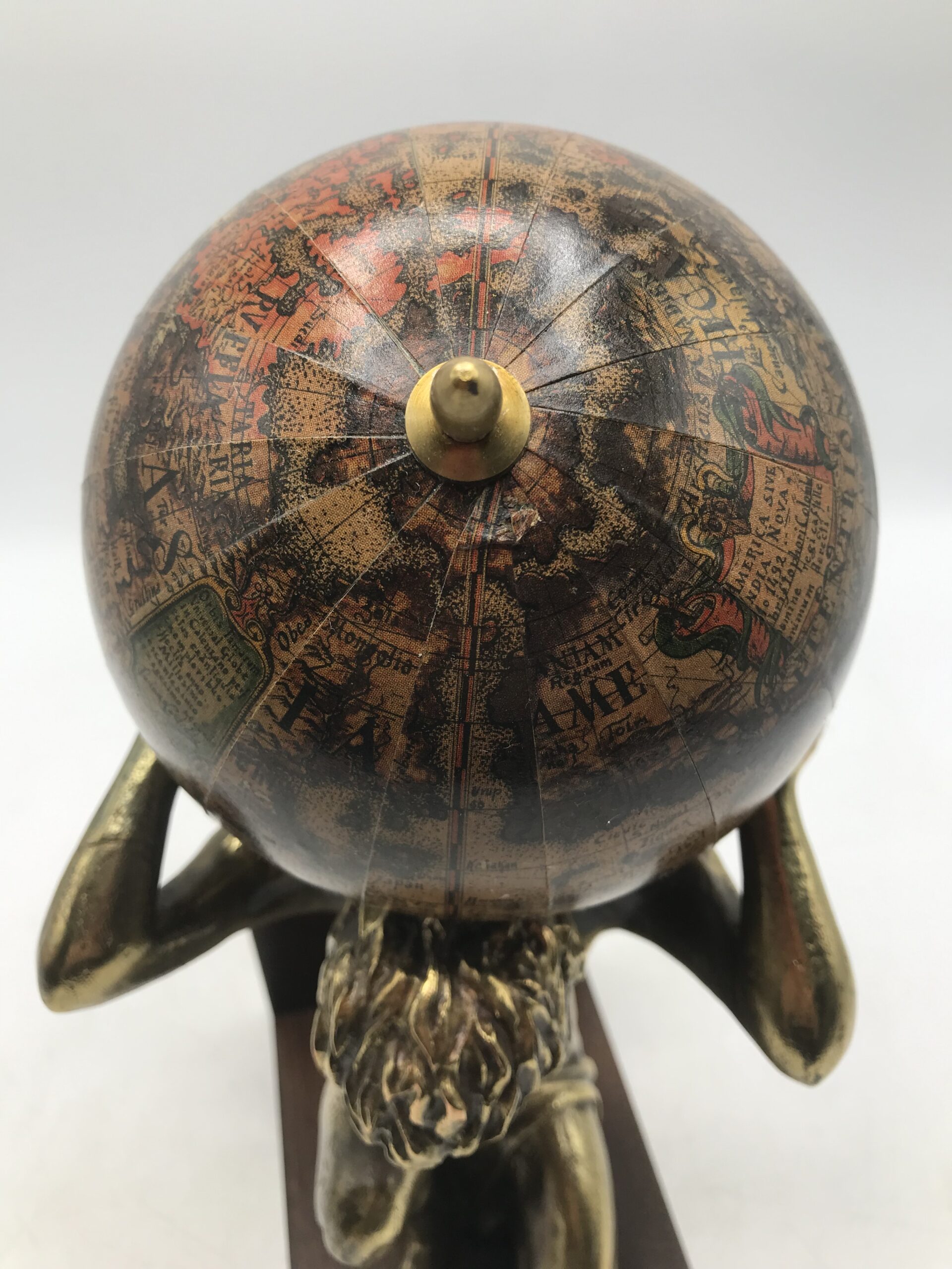 Alerte pépite !!! Paire de serre livres « Géant de l’atlas ». Ces serre-livres italiens représentent le géant Atlas portant le monde sur son dos. Le géant est de couleur dorée, il est fixé sur un socle en bois de couleur marron. Les deux serres livres sont en bon état générale, à noter que les globes présentent d’infimes traces d’usure, invisible de loin (cf photos). Des jolis objets utiles est très décoratifs. Apporter une touche retro dans votre bibliothéque. Avec leur couleur dorée et leur monde type ancien globe, ils feront mouche. Avis aux amateurs de déco et d’ancien livres.