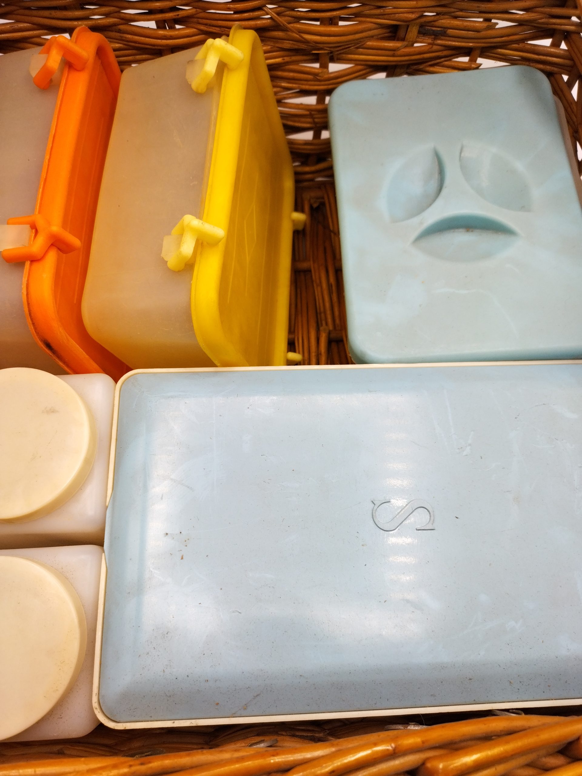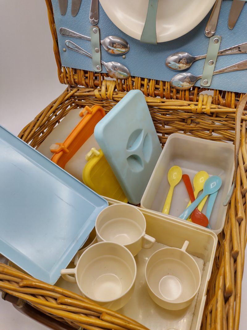 On craque d’amour pour ce joli panier qui est en réalité un set à picnic ! De la marque anglaise Sirram spécialisée dans les couverts et sets à picnic, ce panier se compose d’une série de couverts et de contenants prévue pour 4 personnes : petites assiettes creuses, couverts, tasses à café,4 boîtes en plastique et 2 petites bouteilles carrées. Tous les plats et contenants sont en plastiques à l’exception des couverts qui sont eu en inox. Vintage, quelques traces d’usure sont à prévoir (cf photos) jolies marques du temps passé. Pratique avec sa poignée en cuir, ce joli panier sera le compagnon idéal de vos futurs picnics au parc !
