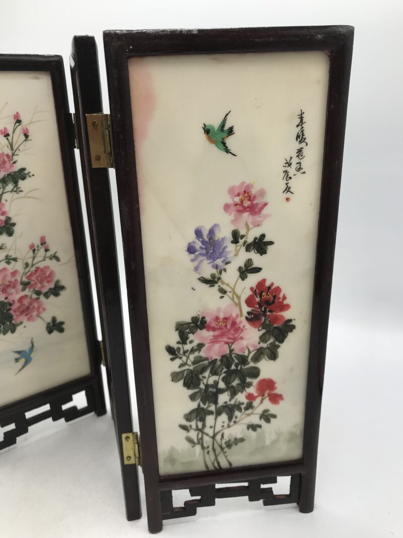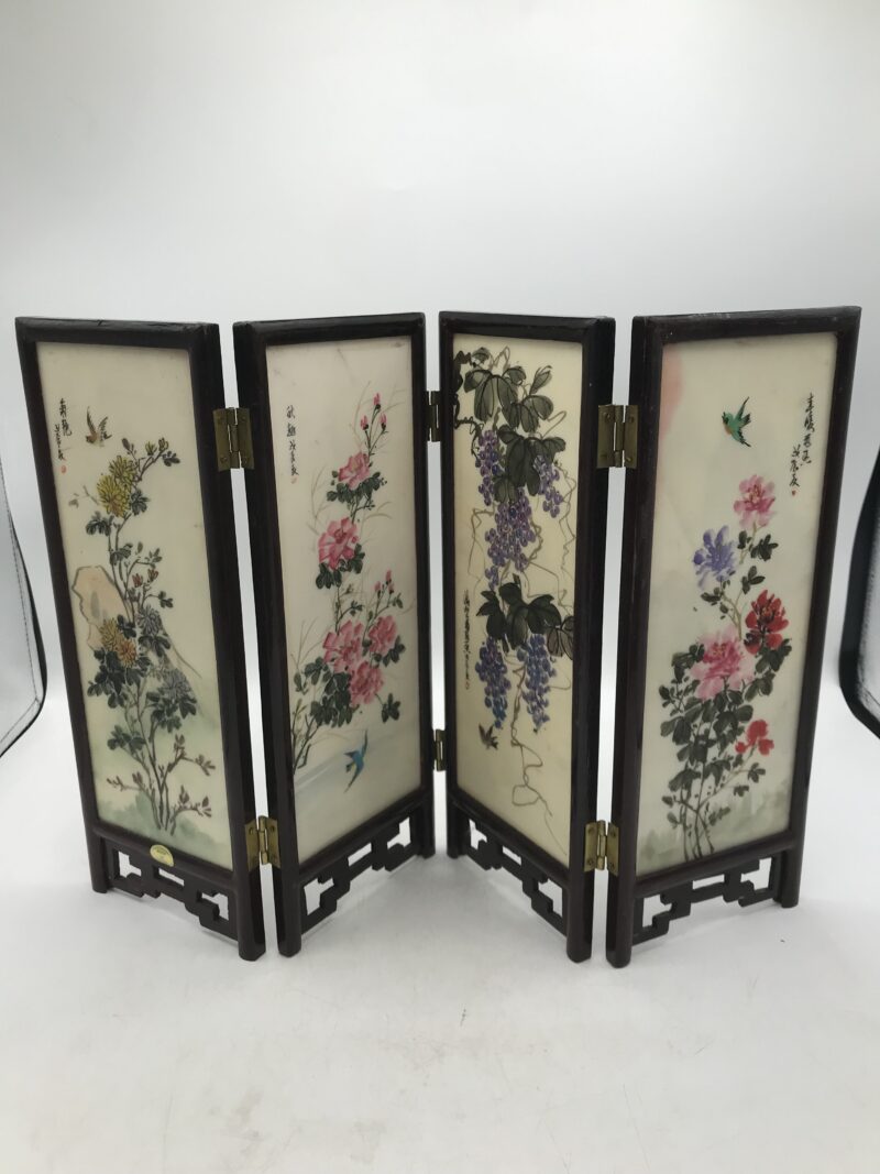 Paravent chinois de table. Très joli petit objet, ce paravent de table vous permettra de créer deux ambiances sur une même table. Pratique avec son petit format, il peut également être juste un objet décoratif. Il est composé de 4 volets avec des dessins différents sur chaque coté (cf photos). Une partie du bois est un peu abimée(cf photo) mais ne gène en rien. Produit exotique qui ne demande qu’a venir compléter une déco qui inspire le voyage. Laissez vous emporter. A saisir