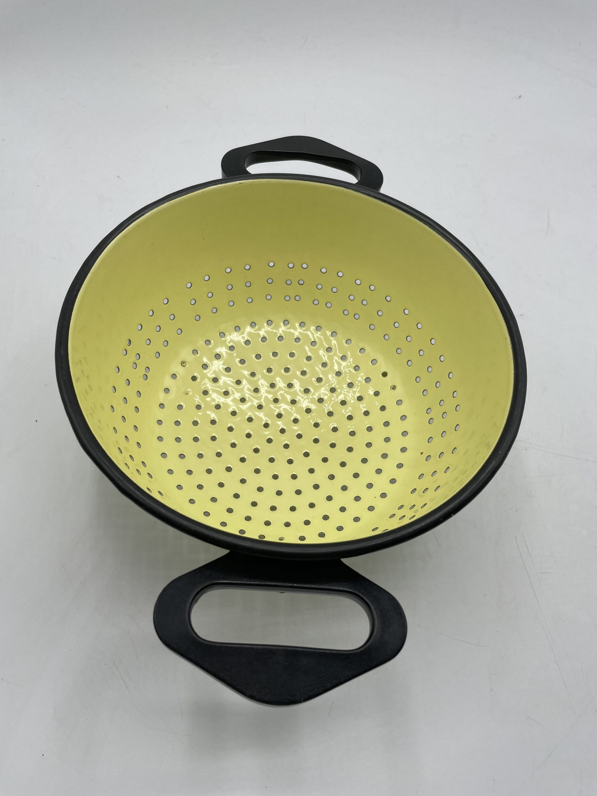 Jolie passoire de style vintage en émail de couleur jaune est noire. Pratique avec ses poignées et son cerclage métalliques, cette jolie passoire en émail vous sera très utile en cuisine. Quelques traces d’usure sont à prévoir (cf photos), jolies marques du temps passé.