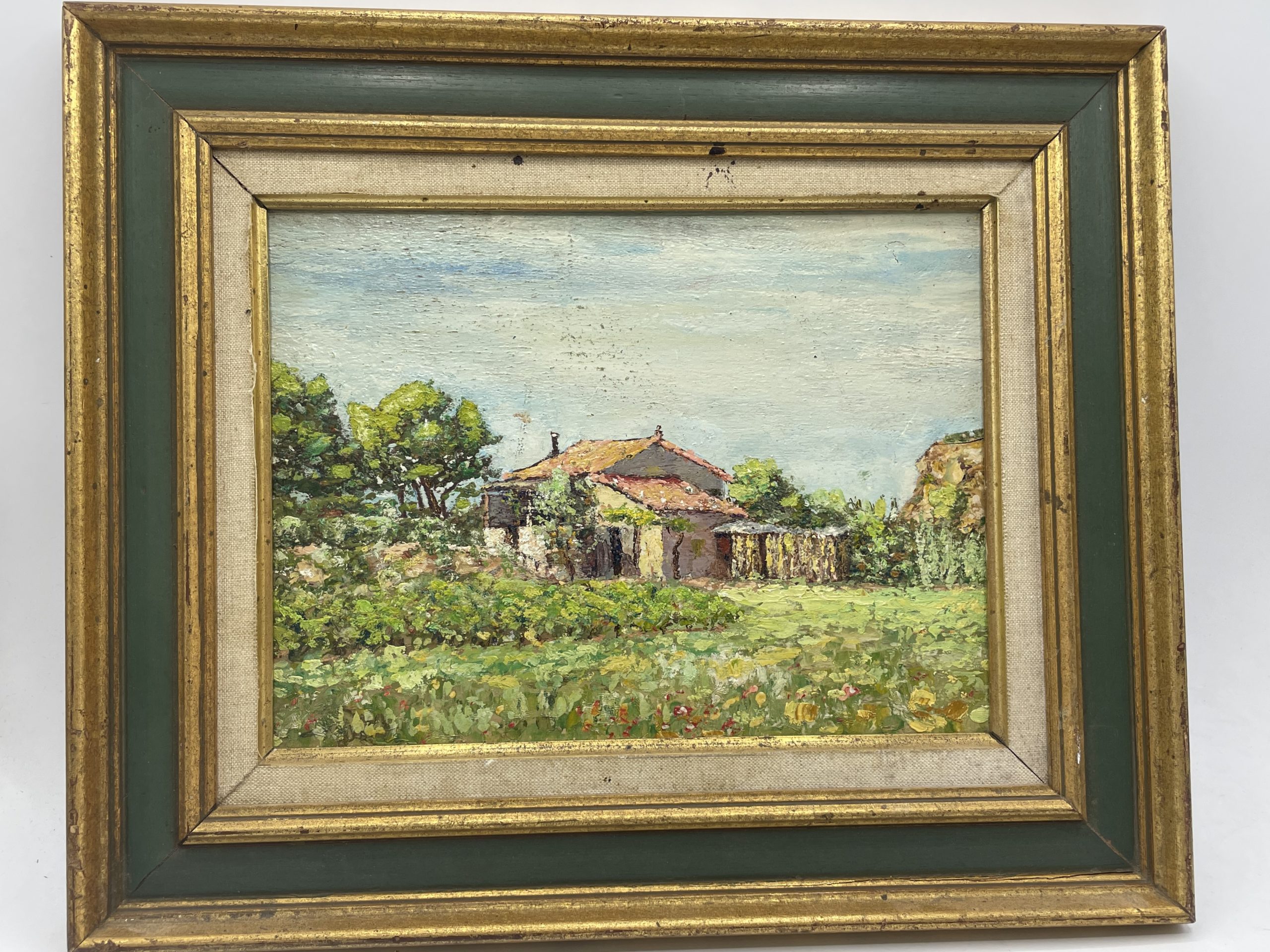 Amateurs d’art et curieux, ce tableau est une jolie peinture à l’huile qui représente un paysage provençal. C’est un paysage au centre duquel on retrouve un mas aux tuiles oranges et à la façade beige typique des maisons provençales. La maison se trouve au milieu d’un jardin fleuri à l’esprit provençal. La peinture a été réalisée sur un panneau derrière lequel on peut lire l’inscription « Alpilles » écrite au crayon à papier. Le tableau est encadré dans une cadre en bois couleur doré et kaki. Vintage, des traces d’usure sont à prévoir (cf photos) jolies marques du temps passé. Un beau tableau à collectionner pour inviter le Sud dans votre intérieur !