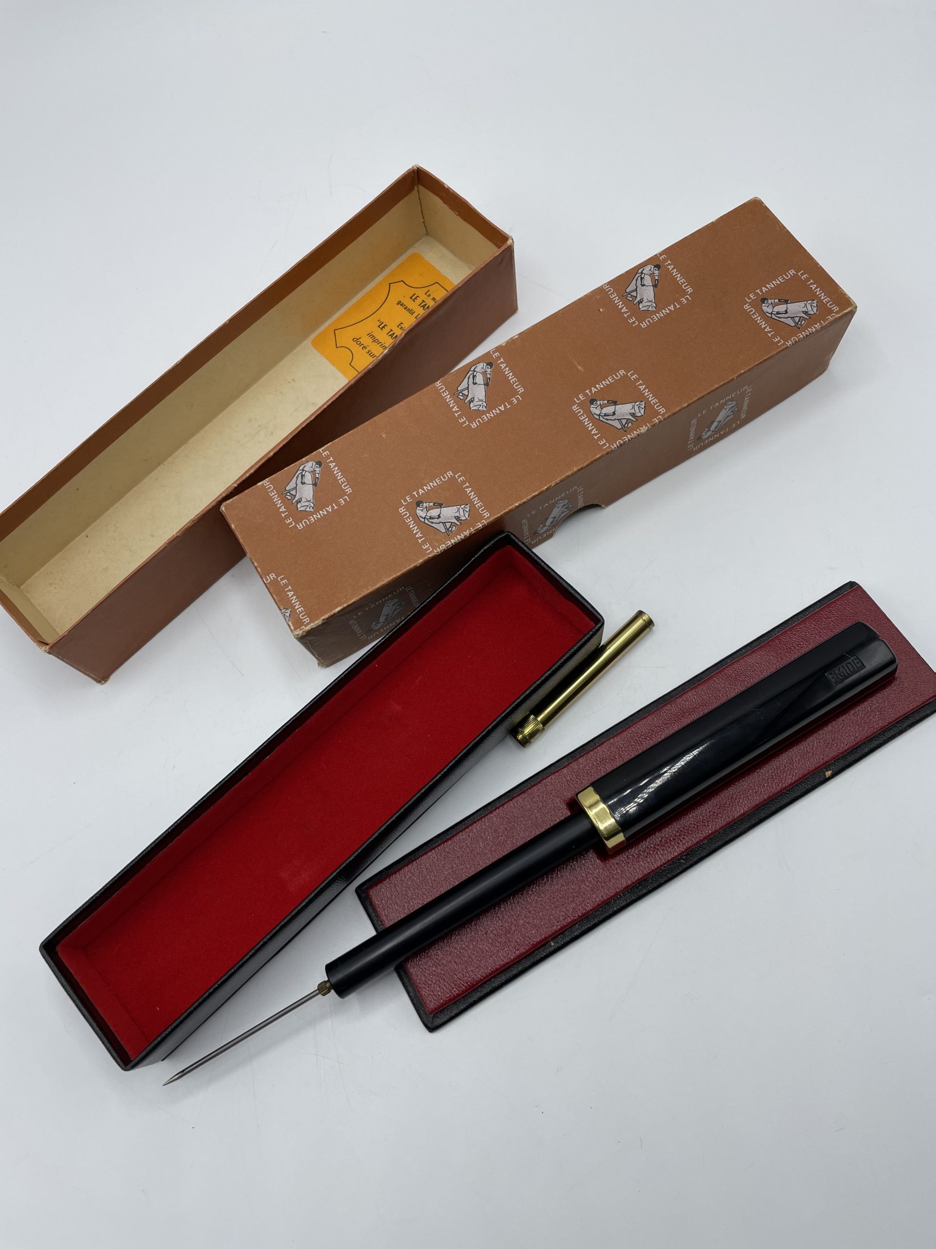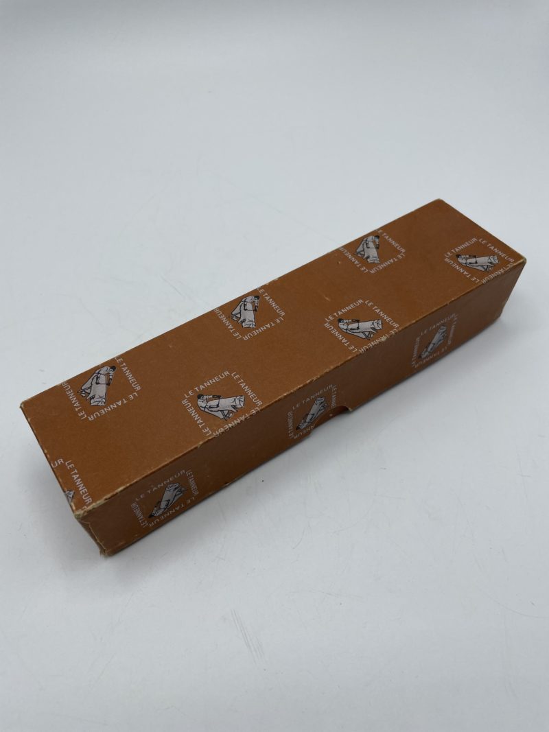 Ce petit objet nous aura fait faire pas mal de recherches… Il s’agit en réalité d’un perforateur vintage pour la maroquinerie de la célèbre marque de maroquinerie Le Tanneur. Le perforateur est rétractable et fonctionne avec un système à air compressé Présenté dans son étui d’origine en cuir estampillé e Tanneur, ce joli perforateur vous aidera à faire de petit trous pour vos ceintures, vos sacs ou vos autres accessoires de maroquinerie.