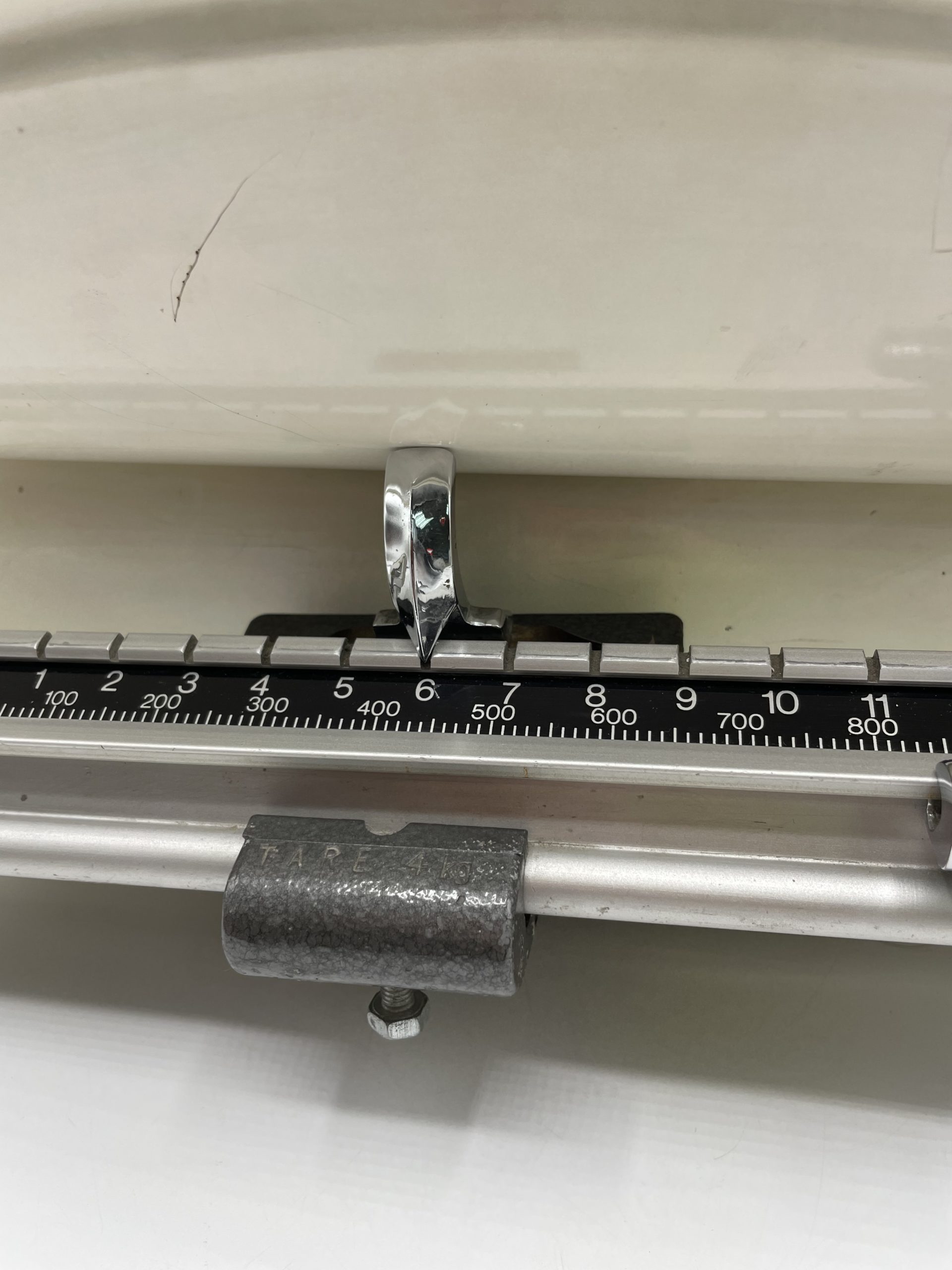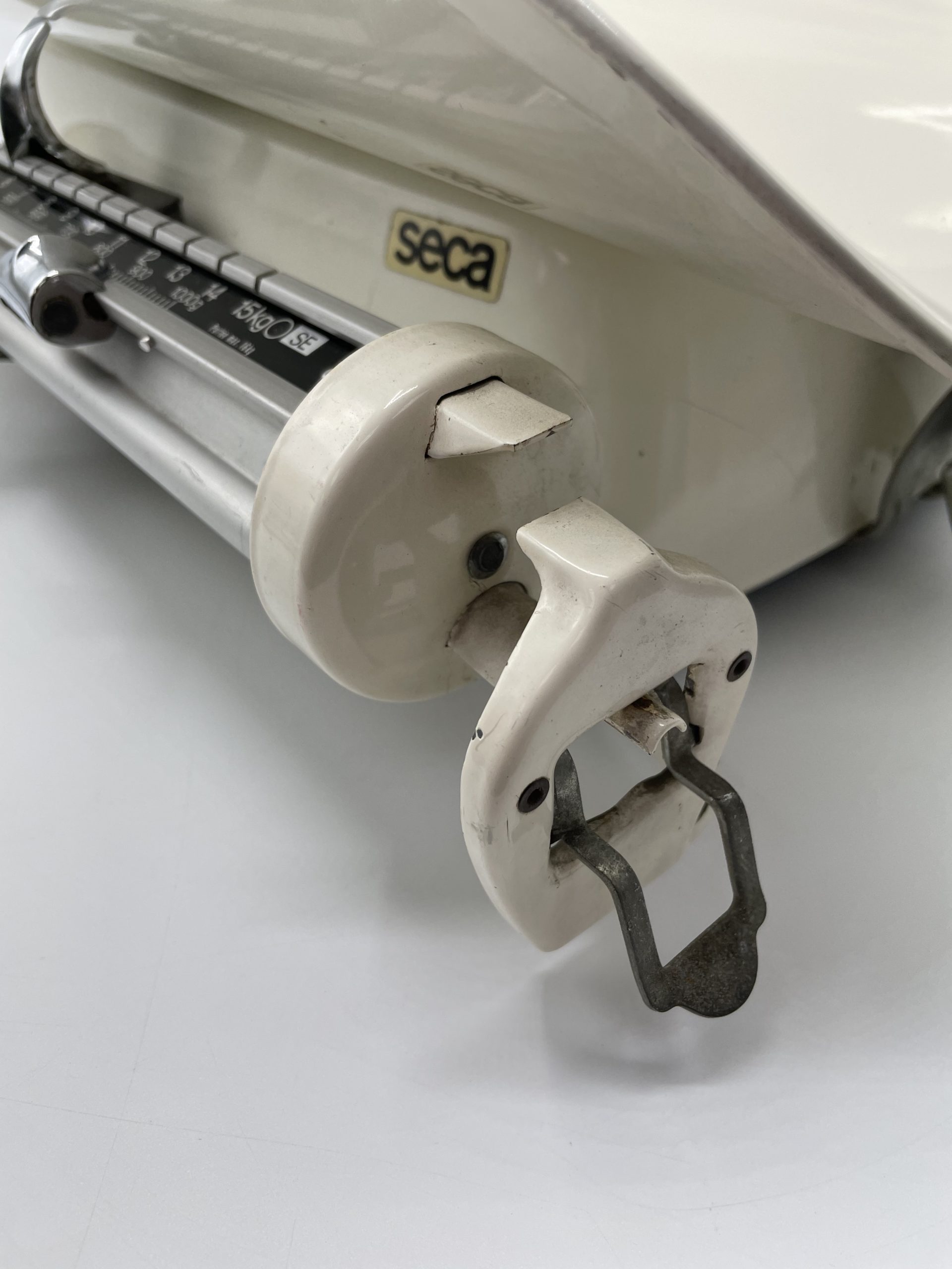 Cette jolie balance est en réalité un pèse bébé. De la marque Seca, il s’agit du modèle 745a. En métal émaillé de couleur beige, le pèse béé a un plateau incurvé qui assure une pesée en toute sécurité pour des poids de 500 grammes à 16kg. Le plateau s’accroche grâce à ses deux crochets ce qui permet de le décrocher facilement pour le nettoyer. Vintage, des traces d’usure sont à prévoir sur l’ensemble de la balance (cf photo) jolies marques du temps passé. Une jolie balance pour peser votre bébé ou comme bel objet déco !