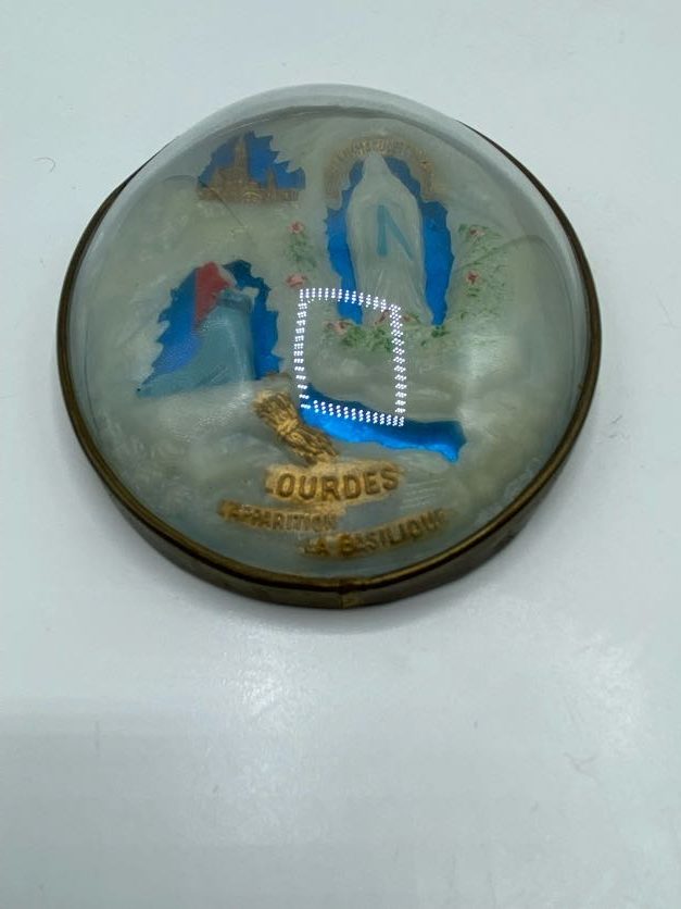 Ce petit cadre de forme ovale représente l’Apparition de l’Immaculée Conception à la grotte de la basilique de Lourdes. Le cadre en laiton est protégé par un verre bombé transparent et la scène semble avoir été taillée dans de la cire. Le cadre est équipé d’un petit crochet qui permet de le fixer contre un mur. Vintage, des traces d’usure sont à prévoir (cf photos) jolies marques du temps passé. Un bel objet souvenir de Lourdes qui apportera protection à votre foyer.