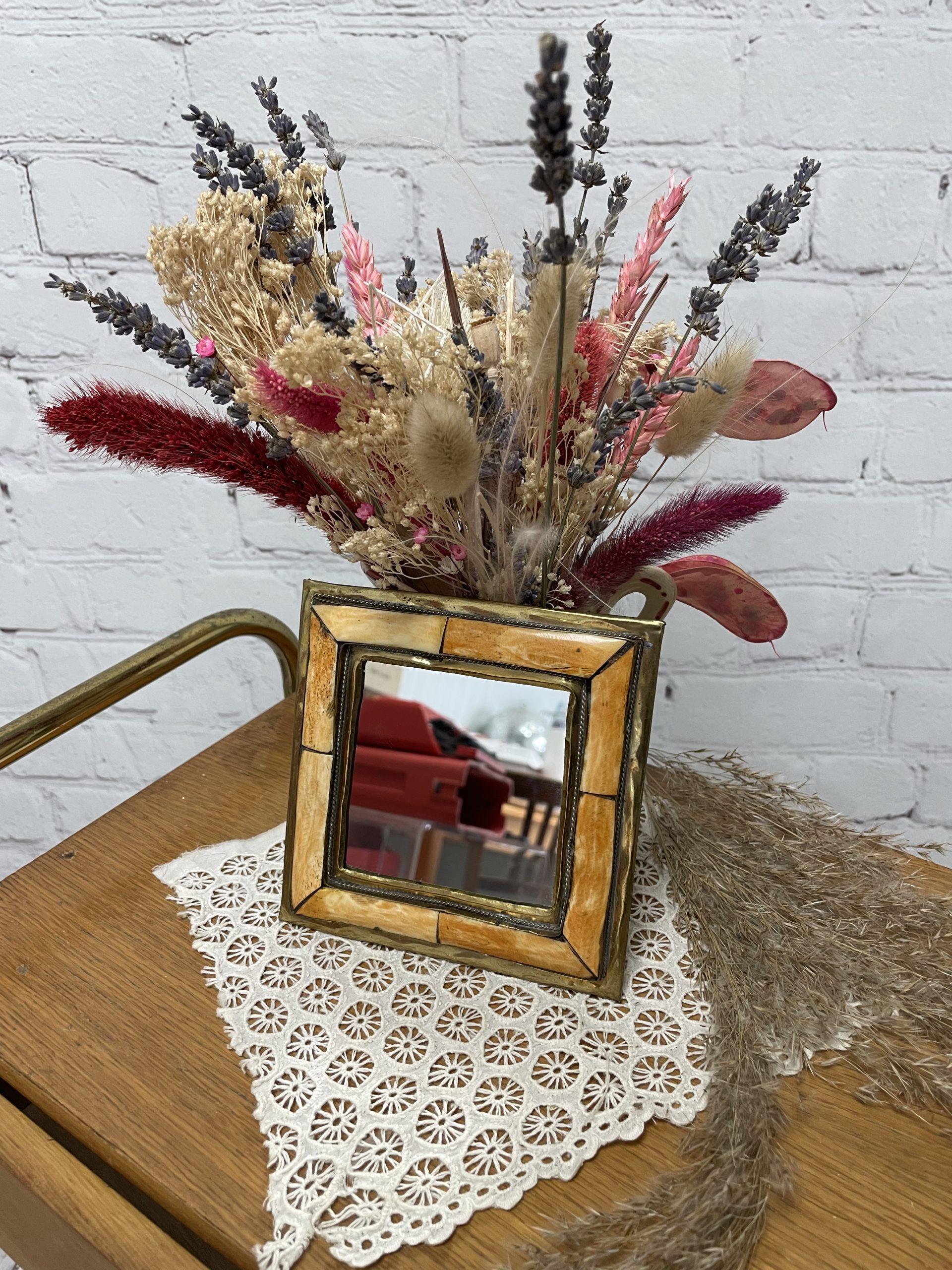 On craque d’amour pour ce tout petit miroir carré. Originaire du Maroc, le miroir est posé sur une plaque en laiton et il est décoré avec un cadre de pièces en résine. Avec sa joli couleur naturelle, ce petit miroir est à poser ou bien à fixer grâce à son petit anneau situé à l’arrière. Un joli petit miroir pour ajouter une touche orientale à votre déco !