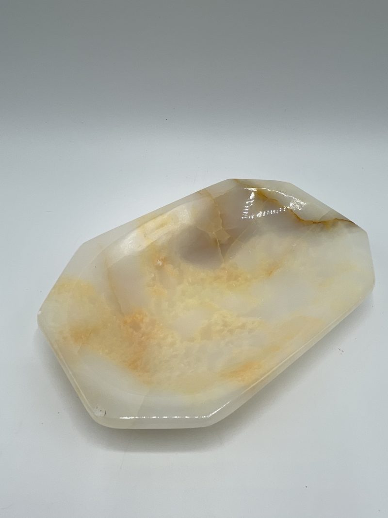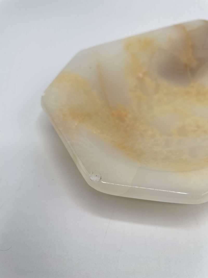 Ce joli petit plat en quartz a une jolie couleur pêche. De forme octogonale et creux, ce plat sera parfait comme vide poche, pour ranger vos bijoux ou encore comme petit plat dans la cuisine. Il y a un petit éclat sur l’un des coins(cf photos), sans grande incidence sur son aspect esthétique. Très bel objet, il peut aussi servir de belle pièce de déco.
