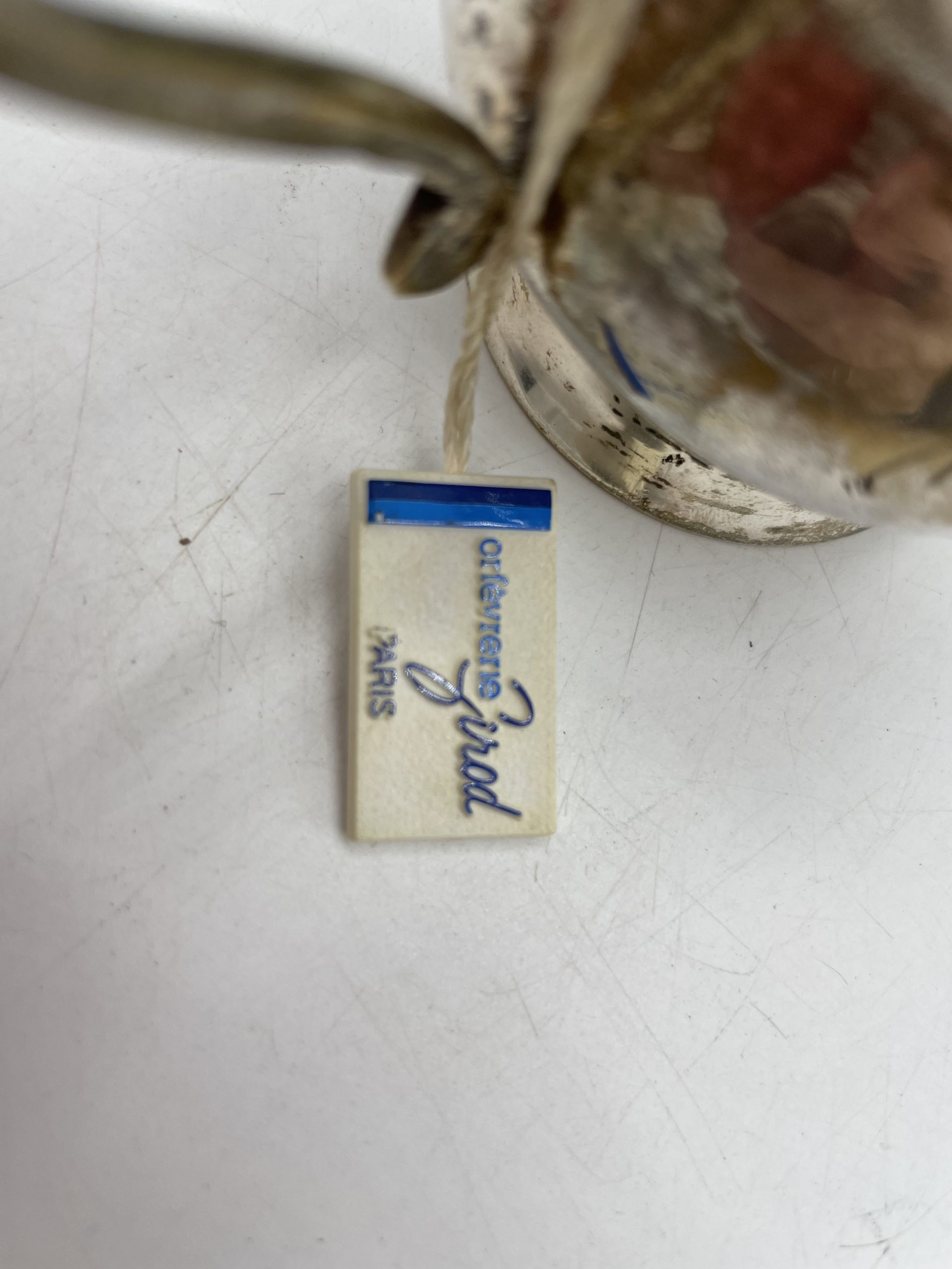Ce joli pot à lait est en méta argenté. Réalisé par l’orfèvrerie Girod située à Paris, le pot à lait vintage est décoré de motifs de fleurs et de couronnes gravées et il est stylisé au niveau du bec avec sa jolie forme style collerette. Vintage, des traces d’usure sont à prévoir (cf photos) jolies marques du temps passé. Le poinçon se trouve au niveau de la anse. Un joli petit pot à collectionner !