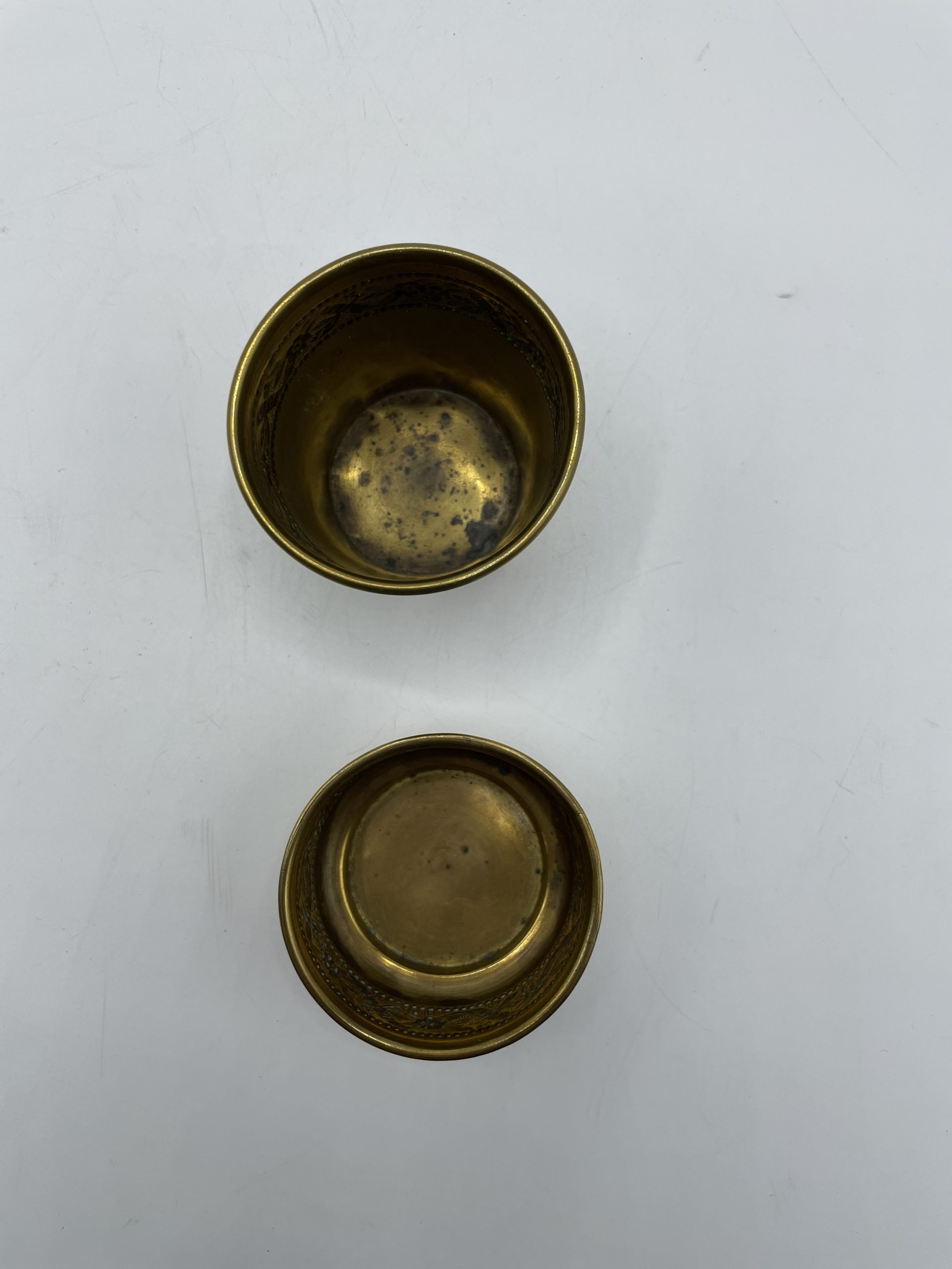 On adore ce petit service à café marocain vintage en laiton. Composé de 4 pièces, on retrouve le petit plateau à fond creux, le sucrier avec on couvercle, 1 verre à café et 1 petite coupelle. D’une jolie couleur dorée, l’ensemble du service est décoré d’une frise de motifs de fleurs. Vintage, des traces d’usure sont à prévoir (cf photos) jolies traces du temps passé. Ce joli service apportera une touche berbère à votre intérieur pour votre pause café ou bien détourné pour la cuisine ou la salle de bain !