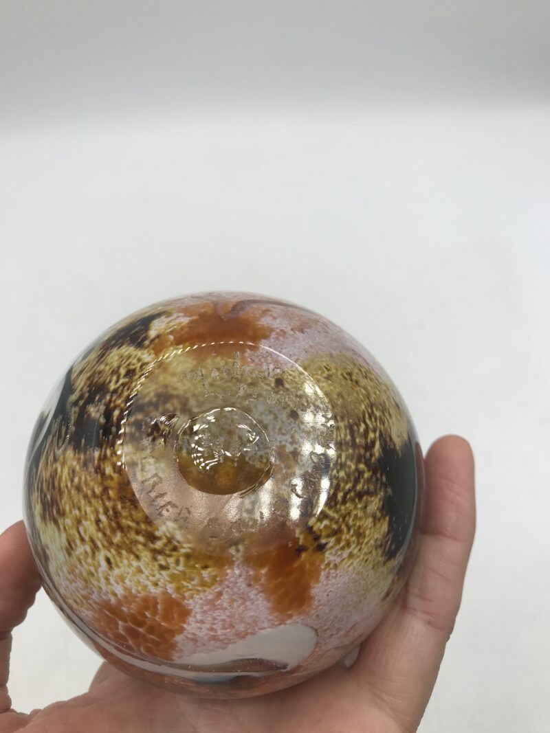 Alerte pépite !!!! Petit vase soliflore signé Michèle Luzoro 1992. Une superbe pièce de collection appelée « Boule corail ». Le vase est en parfait état. Un petit bijoux. Il a une hauteur de 9,5 cm et un diamètre de 8,5 cm, l’ouverture fait 1 cm. Il est en verre avec inclusions de blanc, de rose, de corail, de paillettes cuivre, de marron glacé. Un mélange unique qui le rend si particulier, une merveille qui va en séduire plus d’un. Une belle pièce de collection et de décoration.