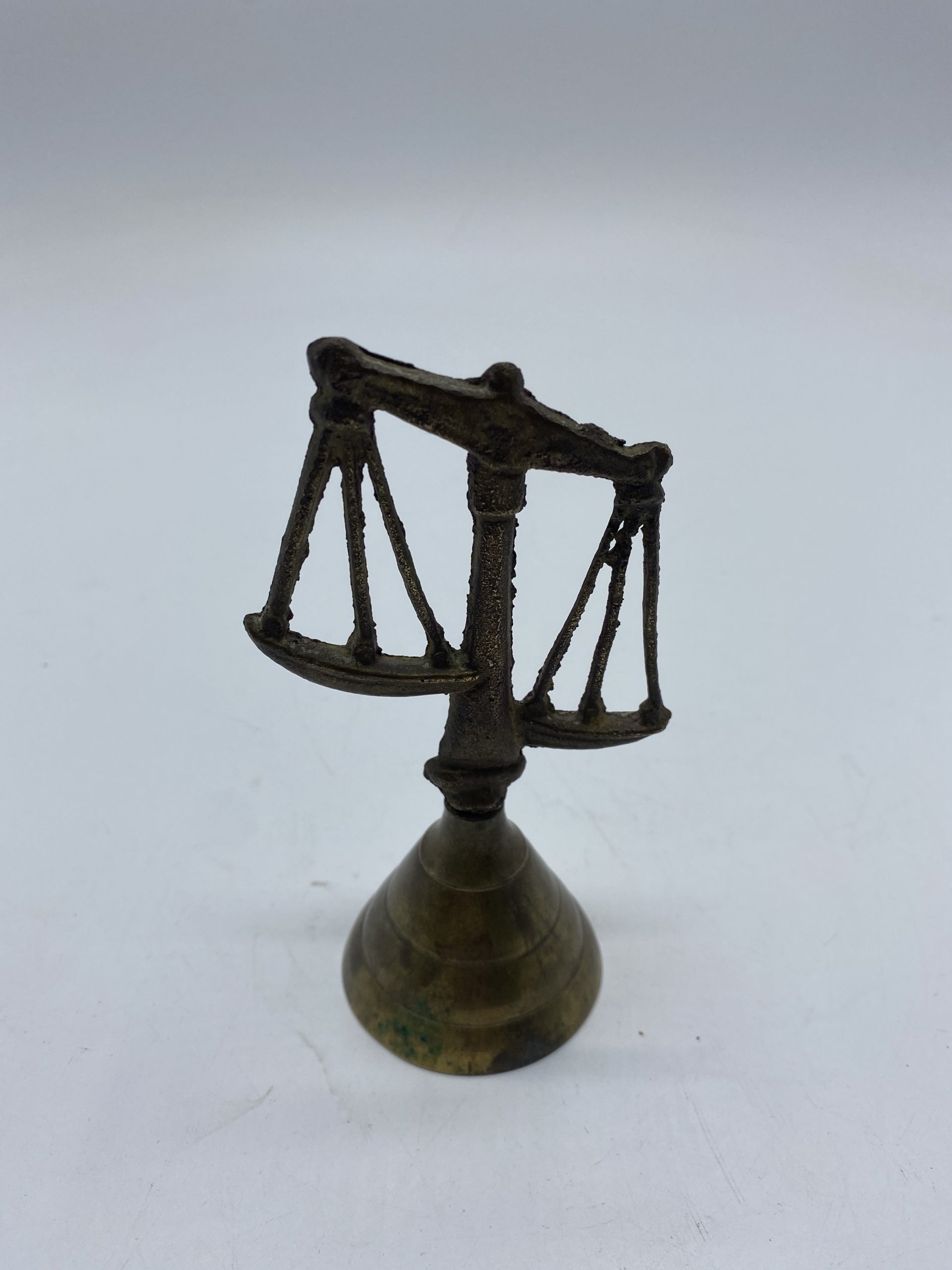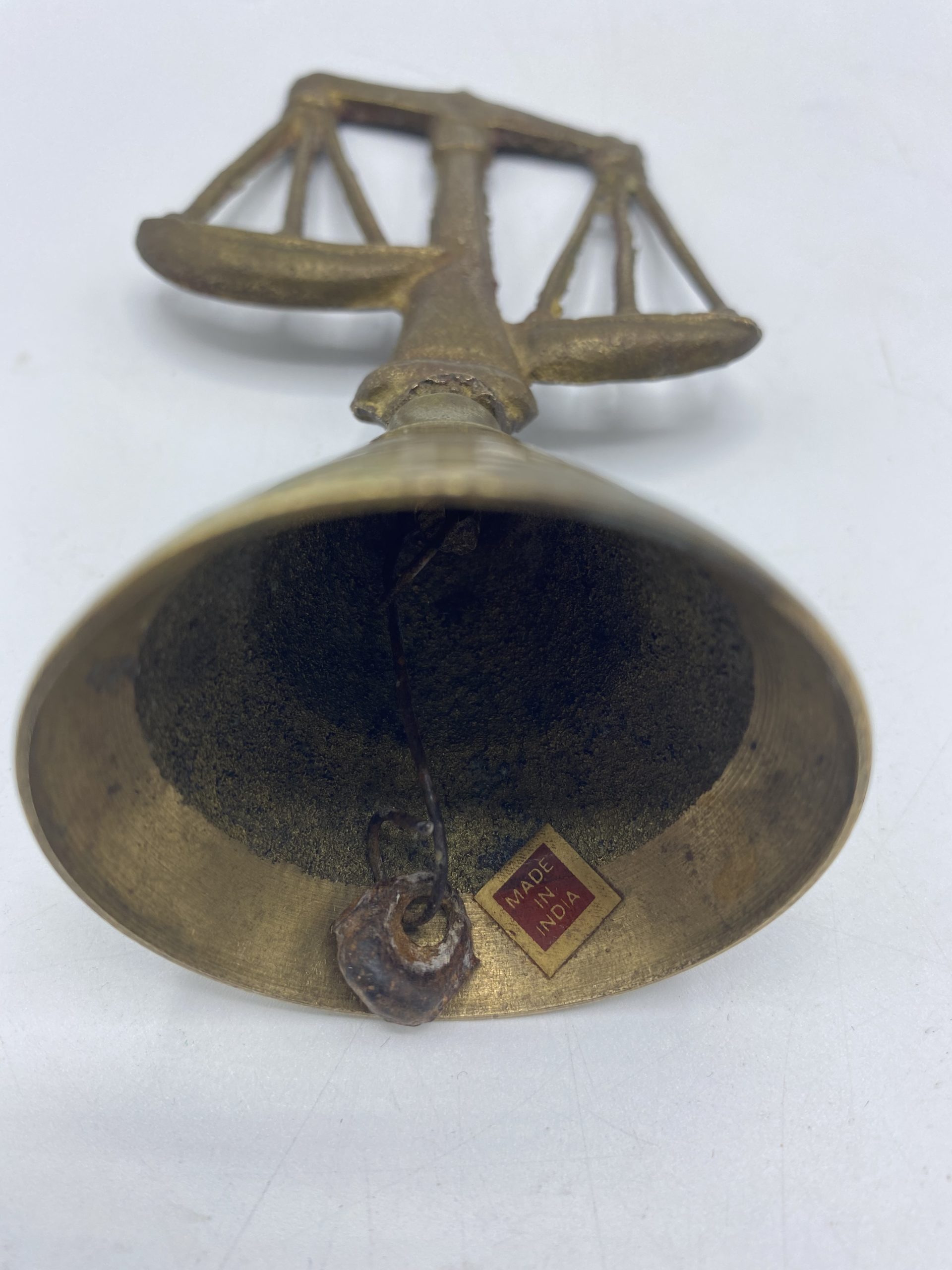 Cette jolie petite cloche en laiton a été fabriquée en Inde. Avec sa jolie forme de balance, la cloche a un joli style. Vintage, des traces d’usure sont à prévoir (cf photos) jolies marques du temps passé. Une jolie petite cloche parfaite sur une table de notaire, d’avocat ou de juriste.