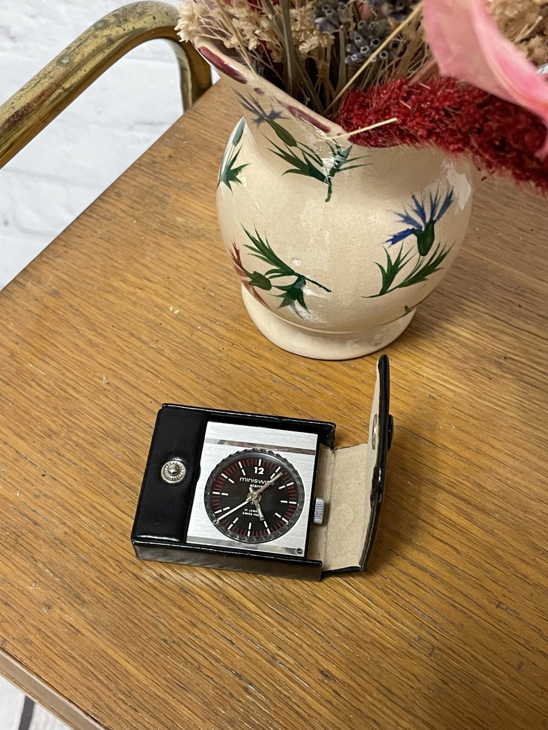 On craque d’amour pour cette petite horloge de poche. Des années 70, cette petite horloge a une alarme intégrée et peut être utilisée comme réveil en voyage. Le boîtier est en aluminium gris et l’horloge est fourni avec son étui de transport d’origine en cuir lisse noir. Vintage, la pile est à changer. Une petite montre de voyage version miniature à collectionner !